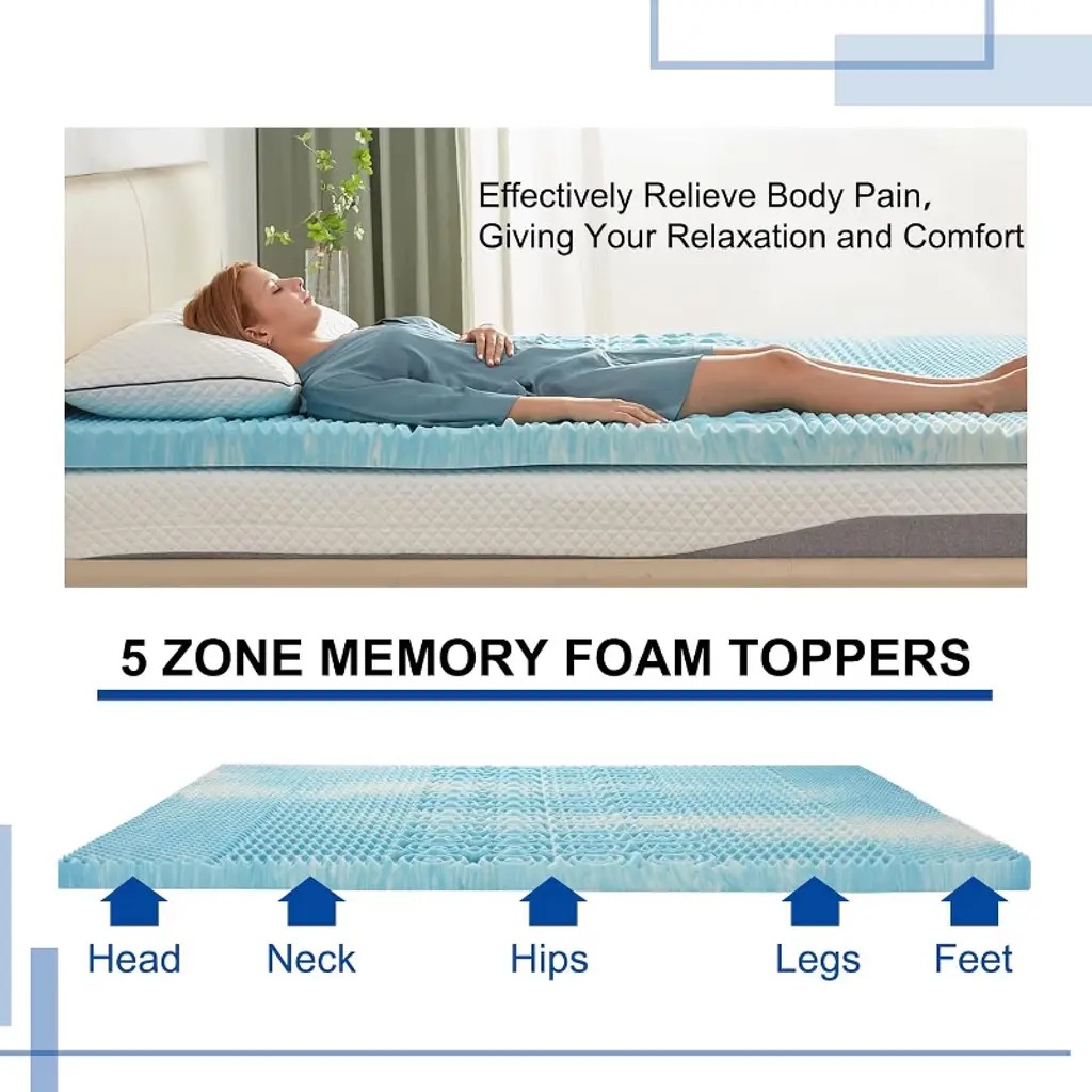 Bestier gel-infused mattress topper features a 5-zone design for targeted support, ensuring personalized comfort for a restful night's sleep. This memory foam mattress topper is crafted from superior slow-rebound memory foam for superior comfort and durability. The cooling mattress topper is infused with plenty of cooling gel to regulate temperature. Tiny channels on the surface effectively distribute heat and enhance airflow for exceptional breathability, keeping you cool and dry. This egg crate mattress topper creates a dry, comfortable sleeping environment.Our bed mattress topper is made with only safe and eco-friendly materials, safeguarding the health of your skin and your family. Available in various sizes and thicknesses, it enhances comfort on any space or occasion, dorms, camping tents, sofa beds, RVs, and more.