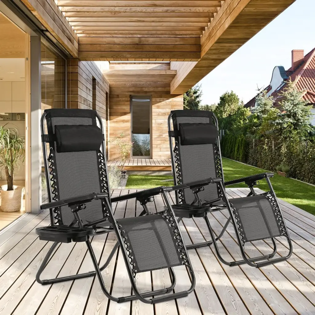 BestMassage Set of 2 Zero-Gravity Recliners is perfect for outdoor relaxation, featuring durable 550g textile fabric that is breathable, lightweight, and weather-resistant. The chairs offer adjustable reclining positions and a supportive headrest for optimal comfort, cradling your spine and relieving pressure. Built with a strong yet lightweight painted steel frame, they can support up to 114 kg (251 lb) and are easy to fold and store. Each chair includes a convenient cup holder tray for drinks and small items, making them ideal for patio, backyard, or poolside lounging.