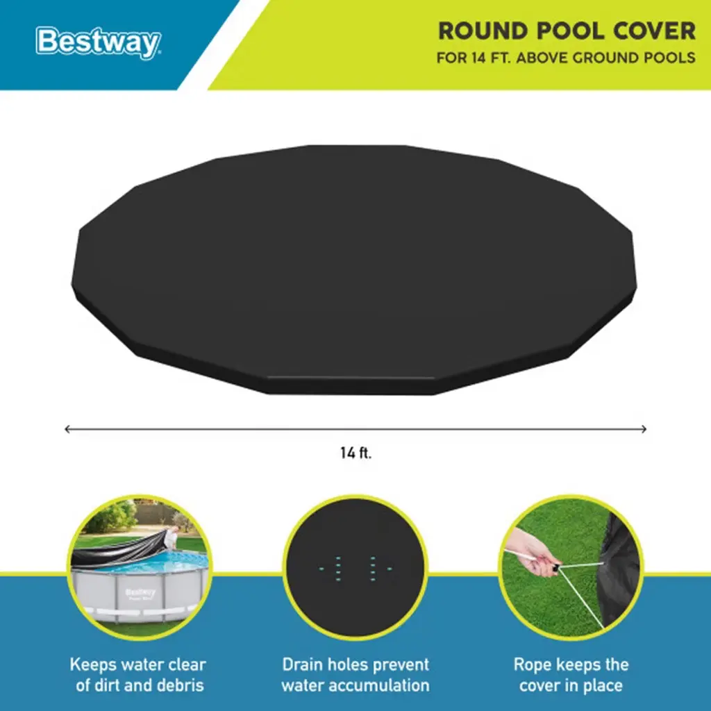 Get peace of mind and ensure that your above-ground pool stays clean and free of debris all year long with the help of the Flowclear Round 14-Foot Pool Cover from Bestway. Made of strong PVC materials, this cover can stand up to the elements and help maximize your pool season. The reliable cover will ensure leaves, sand, trash, and other debris stay out so you can spend more time relaxing in your pool and less time cleaning it. Additionally, having this pool cover helps to reduce costly replacement chemicals when the pool is not in use. Featuring convenient drain holes, this cover for round pools helps avoid excess water accumulation while the tie-down rope ensures a snug fit on the pool so the cover doesn't shift if inclement weather hits. Your above-ground pool will be instantly ready for you to make a splash the moment you take off the cover. This specific cover is recommended for use with 14-foot Steel Pro MAX, and Fast Set above-ground pools. Please note, this is an accessory only and a pool is not included. Minimize maintenance and enjoy pool time more with this pool leaf cover. Whether a bad storm is rolling in, you're packing up for a vacation, or that winter chill is setting in, be prepared to protect your pool from debris with the Bestway Flowclear Round 15-Foot Pool Cover.