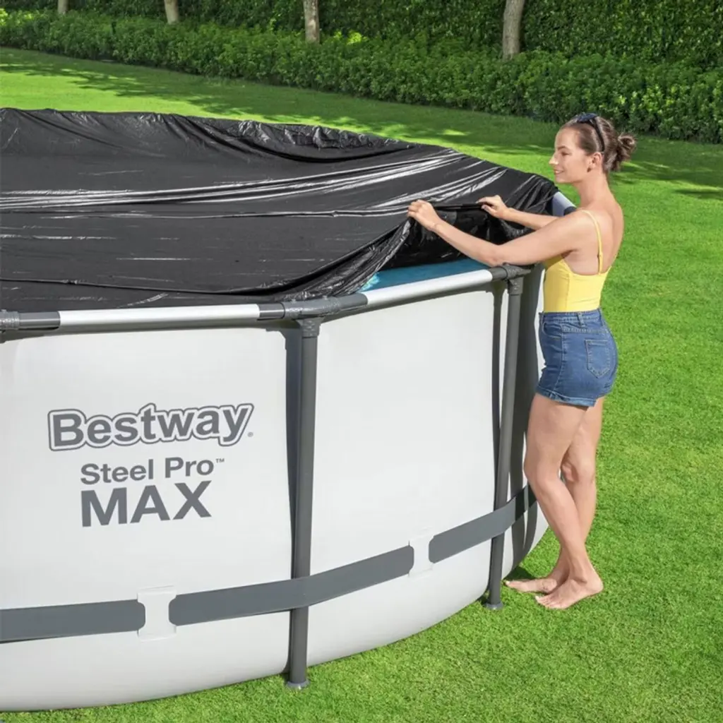 Bestway Flowclear Pvc Round 15 Foot Pool Cover For Above Ground Frame Pools With Drain Holes And Secure Tie-down Ropes, Black (Cover Only)