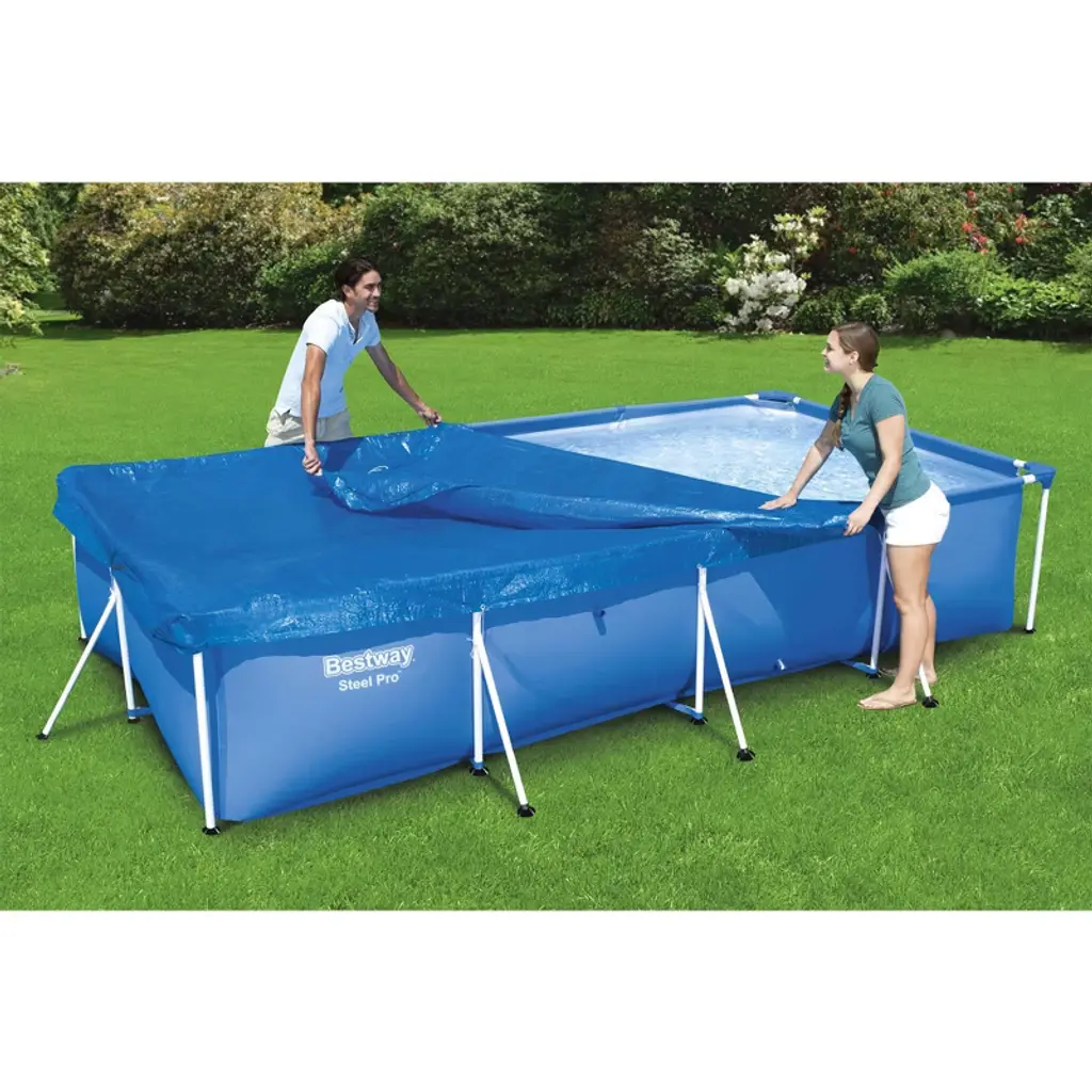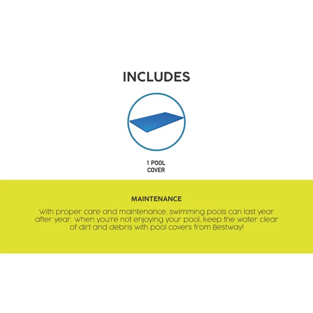 Ensure that your above-ground pool stays clean and free of debris all year long with the help of the Flowclear Rectangle 13-Foot, 1-Inch by 6-Foot, 11-Inch Pool Cover from Bestway. Made of strong PVC materials, this cover can stand up to the elements and help maximize your pool season. The reliable cover will ensure leaves, sand, and other debris stays out so you can spend more time enjoying your pool and less time cleaning it. Designed with a thick construction, the cover deflects UV rays to help keep the water at comfortable temperatures. Featuring handy drain holes, this cover prevents excess water accumulation while the tie-down ropes ensure a snug fit on the pool. Your pool will be instantly ready for you to make a splash the moment you take off the cover. This specific cover is recommended for use with above-ground pools up to 157 inches long, 83 inches wide, and 32 inches tall. Whether a bad storm is rolling in, you're packing up for a vacation, or that winter chill is setting in, be prepared to protect your pool from anything with the Bestway Rectangular Pool Cover. Give the best care and protection for your swimming pool and give it a top-of-the-line above-ground pool cover. Protect your pool when it's not being used with this pool cover from Bestway, Bestway Flowclear Pro Rectangular Pool Cover.