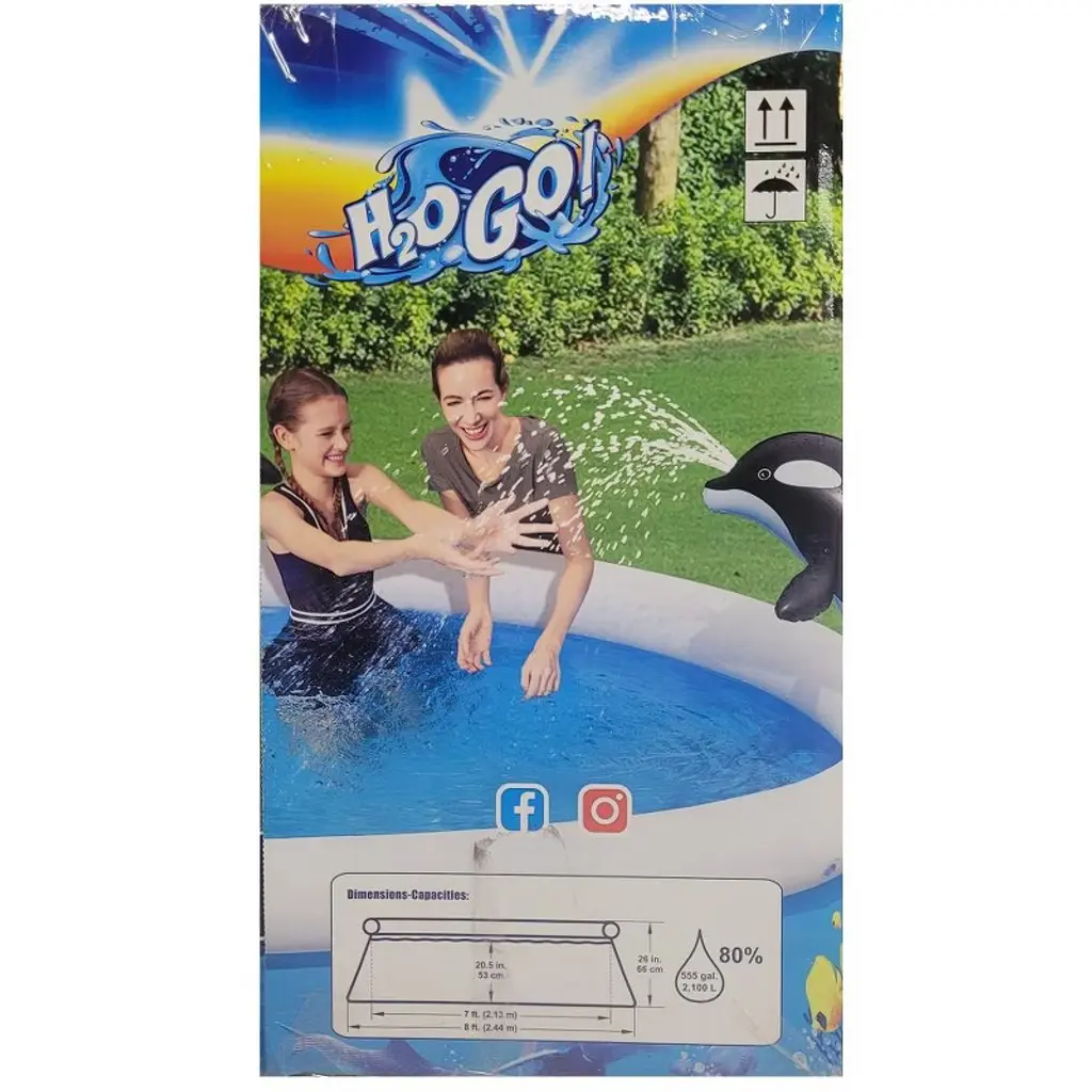 Take the family for dip in the Bestway H2OGO Orca Spray Fast Set Pool 8 ft x 26 in. This pool is perfect for children of all ages. It stands at 26-inches tall and 8-feet wide. Adult supervision is required. The pool sets up in a quick ten minutes. Connect a garden hose to the pool and the Orca Whale will spray water. This pool requires 550 gallons to fill to capacity.