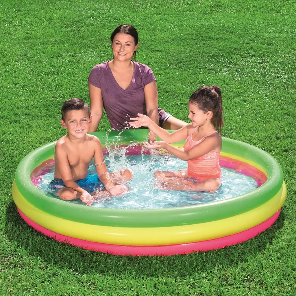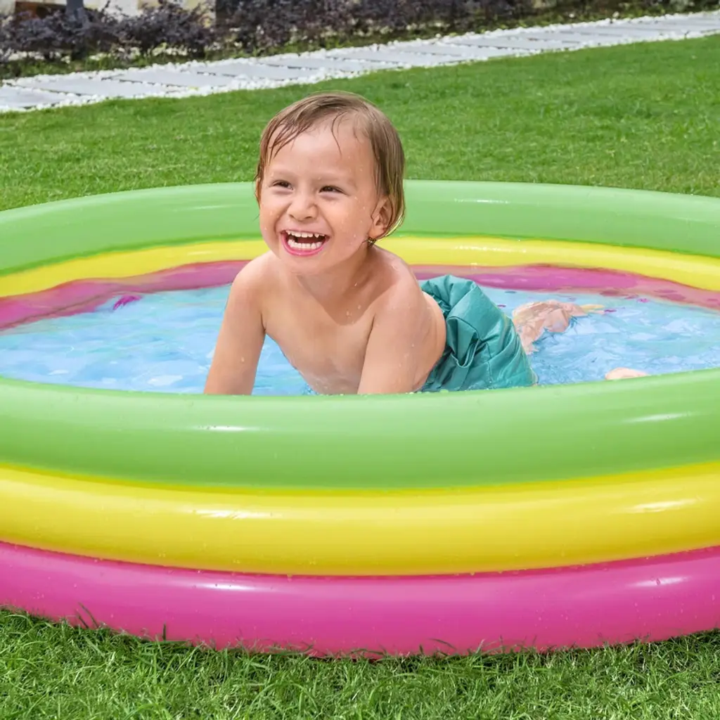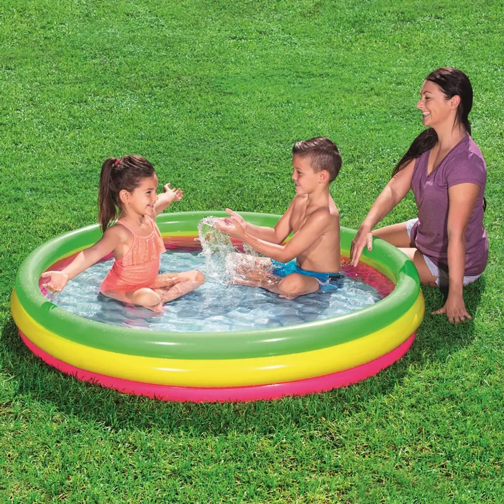H2OGO! SUMMER SET PLAY POOL - The Bestway Summer Set Play Pool is the perfect place for kids to splash about and cool off in the summer sun with friends and family. Easy to set up, the play pool's three air chambers can be quickly inflated via an air pump (not included). The multi-colored, 3-ring construction is not only eye catching but adds stability and durability. The inflatable flooring offers a nice amount of padding when on harder ground. Dimensions: 60" x 12". Water capacity: 56 gal. Repair patch also included. ENDLESS SUMMER FUN: Little kids and toddlers can enjoy swimming and splashing in Bestway's Inflatable Kiddie Pool. It's the ultimate pool for backyard convenience with minimal setup! Great for families with younger children. There's an inflatable floor padding to add stability, durability and extra cushion for your children as they splash and play. MADE TO LAST: A durable, yet lightweight PVC material provides structural integrity to your pool. It's tear-resistant and won't fade overtime to sun exposure. Use this pool summer after summer! EASY TO ASSEMBLE: Just select a level surface, inflate the pool in under 3 minutes, fill with water from a garden hose, and get ready for summer fun in no time! GREAT FOR BEGINNERS: This kids pool is great for young swimmers who are gaining their confidence to swim in deeper and larger pools. DRAINS QUICKLY: At the end of the season, closing the pool is a breeze! A built-in flow control drain valve attaches to a garden hose to drain away water.