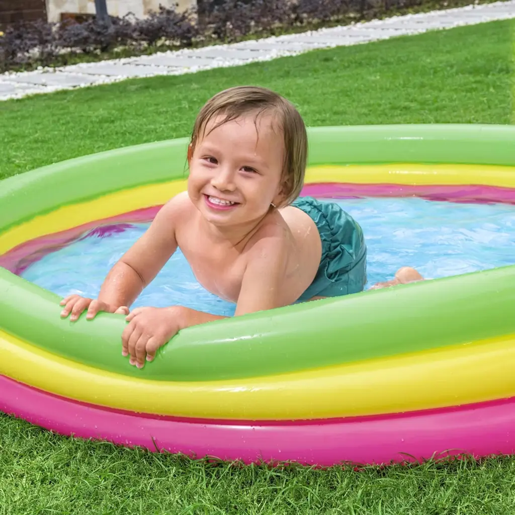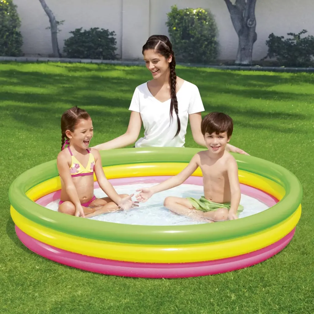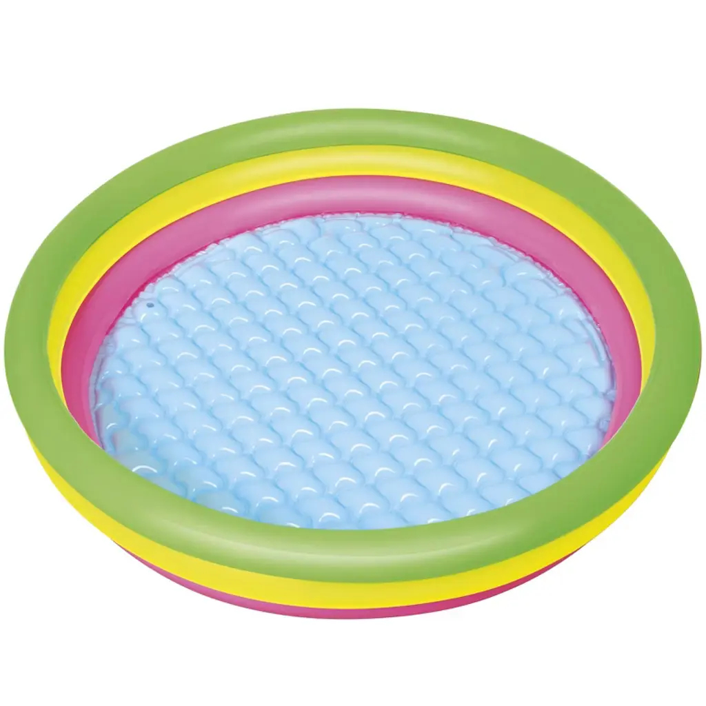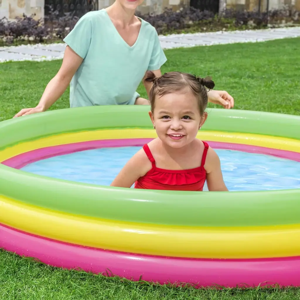 H2OGO! SUMMER SET PLAY POOL - The Bestway Summer Set Play Pool is the perfect place for kids to splash about and cool off in the summer sun with friends and family. Easy to set up, the play pool's three air chambers can be quickly inflated via an air pump (not included). The multi-colored, 3-ring construction is not only eye catching but adds stability and durability. The inflatable flooring offers a nice amount of padding when on harder ground. Dimensions: 60" x 12". Water capacity: 56 gal. Repair patch also included. ENDLESS SUMMER FUN: Little kids and toddlers can enjoy swimming and splashing in Bestway's Inflatable Kiddie Pool. It's the ultimate pool for backyard convenience with minimal setup! Great for families with younger children. There's an inflatable floor padding to add stability, durability and extra cushion for your children as they splash and play. MADE TO LAST: A durable, yet lightweight PVC material provides structural integrity to your pool. It's tear-resistant and won't fade overtime to sun exposure. Use this pool summer after summer! EASY TO ASSEMBLE: Just select a level surface, inflate the pool in under 3 minutes, fill with water from a garden hose, and get ready for summer fun in no time! GREAT FOR BEGINNERS: This kids pool is great for young swimmers who are gaining their confidence to swim in deeper and larger pools. DRAINS QUICKLY: At the end of the season, closing the pool is a breeze! A built-in flow control drain valve attaches to a garden hose to drain away water.