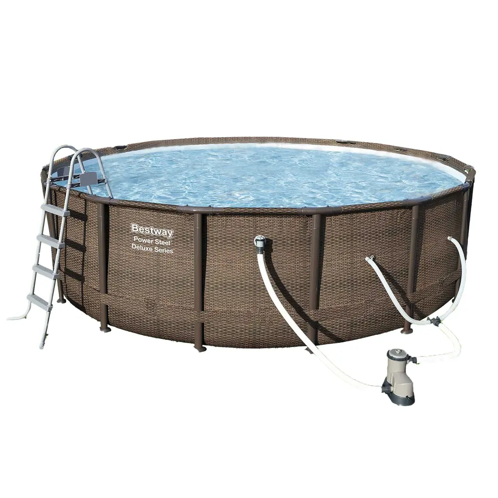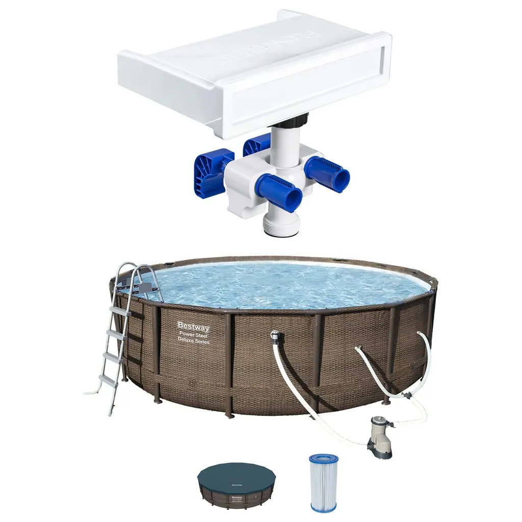 Enjoy the sunshine, along with the calming sounds of running water with the Bestway LED Waterfall and Power Steel Above Ground Swimming Pool Set. Designed for easy installation and use, this cordless waterfall attachment with adjustable clamps fits requires a pump flow rate of 530 to 3,000 GPH. Offering 7 single-color modes and 1 dazzling alternating mode, the LED lights are equipped with an automatic timer that turns them off after 2 hours, extending their battery and bulb life. The above-ground pool boasts an ultra-durable construction. Its corrosion-proof steel frame, featuring a seal and lock system, ensures a sturdy and secure connection. The reinforced TriTech liner adds strength and puncture resistance. Complete with a filter pump, ladder, and pool cover, it provides all you need for a perfect pool day. Setup and takedown are simple, with no tools required. The built-in flow control valve, connected to a shoe, allows for quick and efficient draining of the pool water. Enjoy a summer full of fun with the Bestway LED Waterfall and Power Steel Above Ground Swimming Pool Set. Add a touch of summer fun and tranquility to your backyard with this waterfall cascade accessory and above-ground swimming pool set Waterfall cascade offers a range of lights with 7 single-color modes and 1 alternating mode; Built-in light automatically turns off after 2 hours; Powered by 3 AA batteries (not included) Provides a sheer and gentle cascade of water while refreshing negative ions at the surface; Installation is made easy with adjustable mounting clamps Pool's steel frame secured with the Seal and Lock System ensures exceptional strength and stability; TriTech enhanced 3-ply PVC liner provides a support band for additional pool wall stability Features a simple assembly and take-down process for off-season storage; No tools are required; Includes a 680-gallon per hour filter pump, a ladder for safe entry and exit, and a pool cover Bestway Above Ground Swimming Pool 7 Colored LED Relaxing Waterfall Cascade Requires a pump flow rate of 530 to 3,000 GPH Offers serenity and relaxation while you enjoy time outside in the pool Includes one adapter to connect to both 1.25-inch and 1.5-inch hoses IP67 waterproof rating Color: White Dimensions (L x W x H): 12.6 x 9.45 x 13.58 inches Weight: 4.47 pounds Bestway Power Steel 14-Foot 42 Inches Above Ground Outdoor Swimming Pool Set with Pump Hose connects to the built-in flow control valve to quickly and easily drain away the pool water ChemConnect dispenser maintains clean, healthy pool water by providing stable levels of chlorine that's evenly dispersed throughout the pool Disclaimer: Please review your HOA rules and restrictions before purchasing the product; Not all housing agencies permit private above-ground pools Water capacity: 3,440 gallons (90% full) Color: Brown Dimensions (L x W x H): 168 x 168 x 42 inches