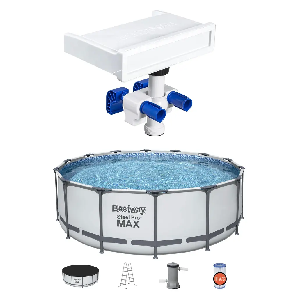 Enjoy the sunshine, along with the calming sounds of running water with the Bestway LED Waterfall and Steel Pro MAX Above Ground Swimming Pool Set. Designed for easy installation and use, this cordless waterfall attachment with adjustable clamps fits requires a pump flow rate of 530 to 3,000 GPH. Offering 7 single-color modes and 1 dazzling alternating mode, the LED lights are equipped with an automatic timer that turns them off after 2 hours, extending their battery and bulb life. The above-ground pool boasts an ultra-durable construction. Its corrosion-proof steel frame, featuringFrameLink system, ensures a sturdy and secure connection. The DuraPlus 3-ply liner provides a support band for stability. Complete with a filter pump, ladder, and pool cover, it provides all you need for a perfect pool day. Setup and takedown are simple, with no tools required. Enjoy a summer full of fun with the Bestway LED Waterfall and Steel Pro MAX Above Ground Pool with Pump and Cover. Disclaimer: Please review your HOA rules and restrictions before purchasing this product. Not all housing agencies permit private above-ground pools. Add a touch of summer fun and tranquility to your backyard with this waterfall cascade accessory and above-ground swimming pool set Waterfall cascade offers a range of lights with 7 single-color modes and 1 alternating mode; Built-in light automatically turns off after 2 hours; Powered by 3 AA batteries (not included) Provides a sheer and gentle cascade of water while refreshing negative ions at the surface; Installation is made easy with adjustable mounting clamps Pool's steel frame secured with the FrameLink System ensures remarkable strength and connection; DuraPlus enhanced 3-ply PVC liner provides a support band for additional pool wall stability Features a simple assembly and take-down process for off-season storage; No tools are required; Includes a 1,000-gallon filter pump, a ladder, and a pool cover Bestway Above Ground Swimming Pool 7 Colored LED Relaxing Waterfall Cascade Requires a pump flow rate of 530 to 3,000 GPH Offers serenity and relaxation while you enjoy time outside in the pool Installation is made easy with adjustable mounting clamps Includes one adapter to connect to both 1.25-inch and 1.5-inch hoses IP67 waterproof rating Color: White Dimensions (L x W x H): 12.6 x 9.45 x 13.58 inches Weight: 4.47 pounds Bestway Steel Pro MAX 14-Foot by 48-Inch Round Above Ground Swimming Pool with Pump & Cover Prismatic stone print design lines the interior to create an elegant look that blends with backyard aesthetics Hose connects to the built-in flow control valve to quickly and easily drain away the pool water Disclaimer: Please review your HOA rules and restrictions before purchasing the product; Not all housing agencies permit private above-ground pools Water capacity: 4,024 gallons (90 percent full) Color: Gray Dimensions (L x H): 14 feet x 48 inches