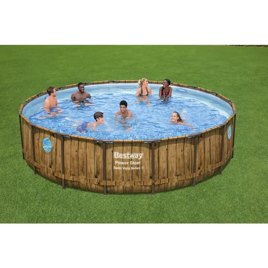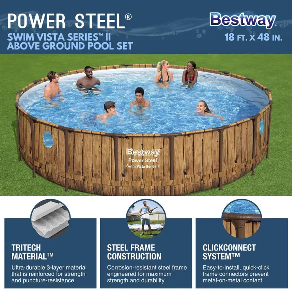 Bestway Power Steel Swim Vista Series Ii 18' X 48" Round Above Ground Outdoor Swimming Pool Set With Built-in Windows, Filter Pump, Ladder, And Cover