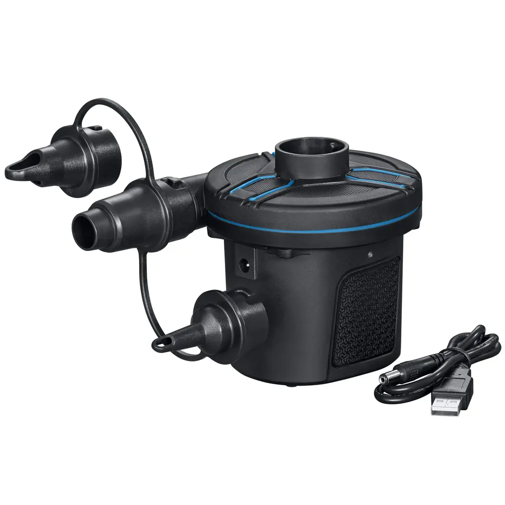 Inflate all your favorite items with the cordless Bestway® PowerTouch™ Rechargeable 4.8V Electric Air Pump! It can inflate most air mattresses, pool floats, swim rings, beach balls, other inflatable toys and more. Designed with a large air chamber to provide maximum airflow, this sturdy, two-color pump has an airflow rate of 565 L/min and recharges using the included USB cord. It also comes with four 1500mA built-in rechargeable batteries. Plus, three universal valve adapters are included to fit nearly every inflation valve, so you're able to inflate a variety of items with the same pump! With its compact cordless design, the Bestway PowerTouch Rechargeable 4.8V Electric Air Pump is great for inflating your items at home or on-the-go!. Max Air Flow: 565 L/min. DC 4.8V 55W. Max Pressure: 370 mmH2O (0.52 PSI /0.036 BAR). Quickly inflates and deflates almost all inflatable products. Designed to provide maximum airflow. Two-color design. Large air chamber for rapid inflation. Built-in rechargeable batteries - 4x 1500mA capacity. USB powered. 3 valve adaptors to fit nearly every inflation valve. Contents: 1 electric pump.