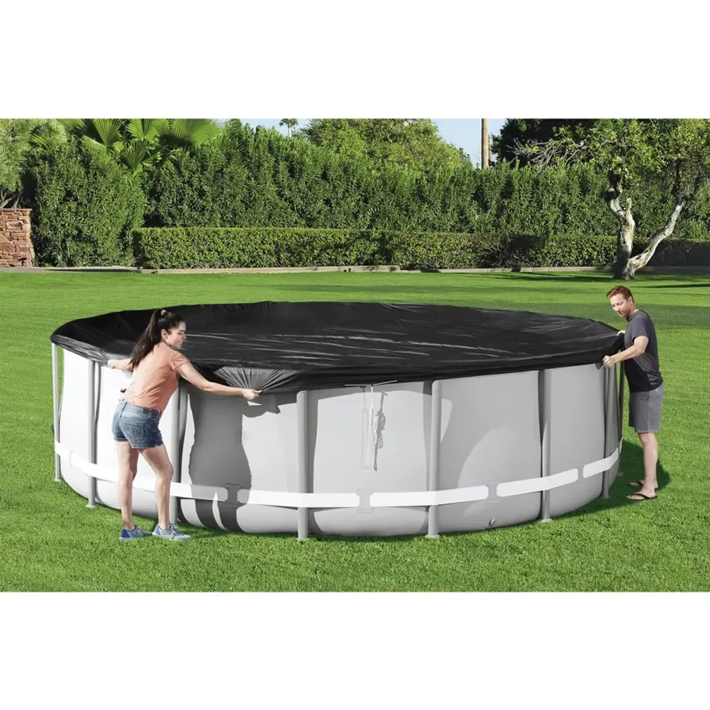 Bestway Round Pvc 16 Foot Pool Cover For Above Ground Pro Frame Pools With Drain Holes And Secure Tie-down Ropes, Black (Cover Only)