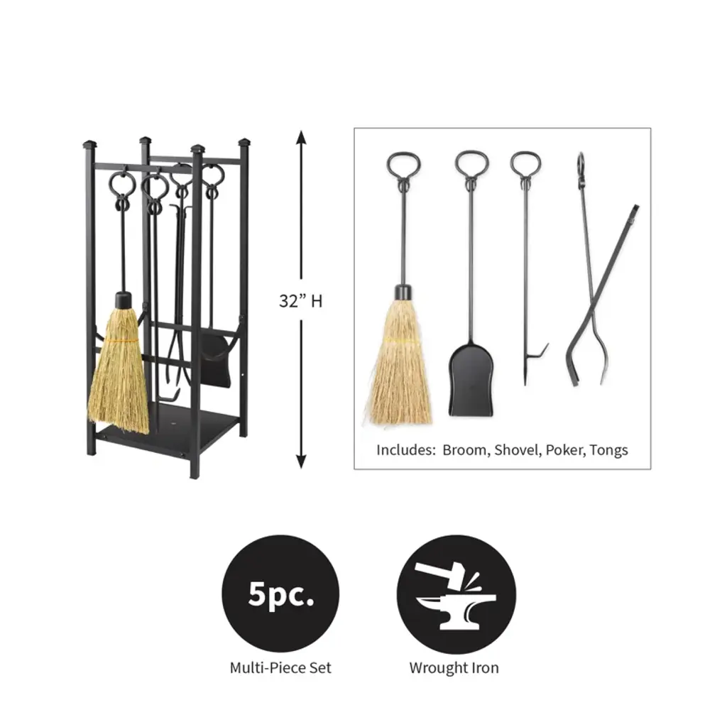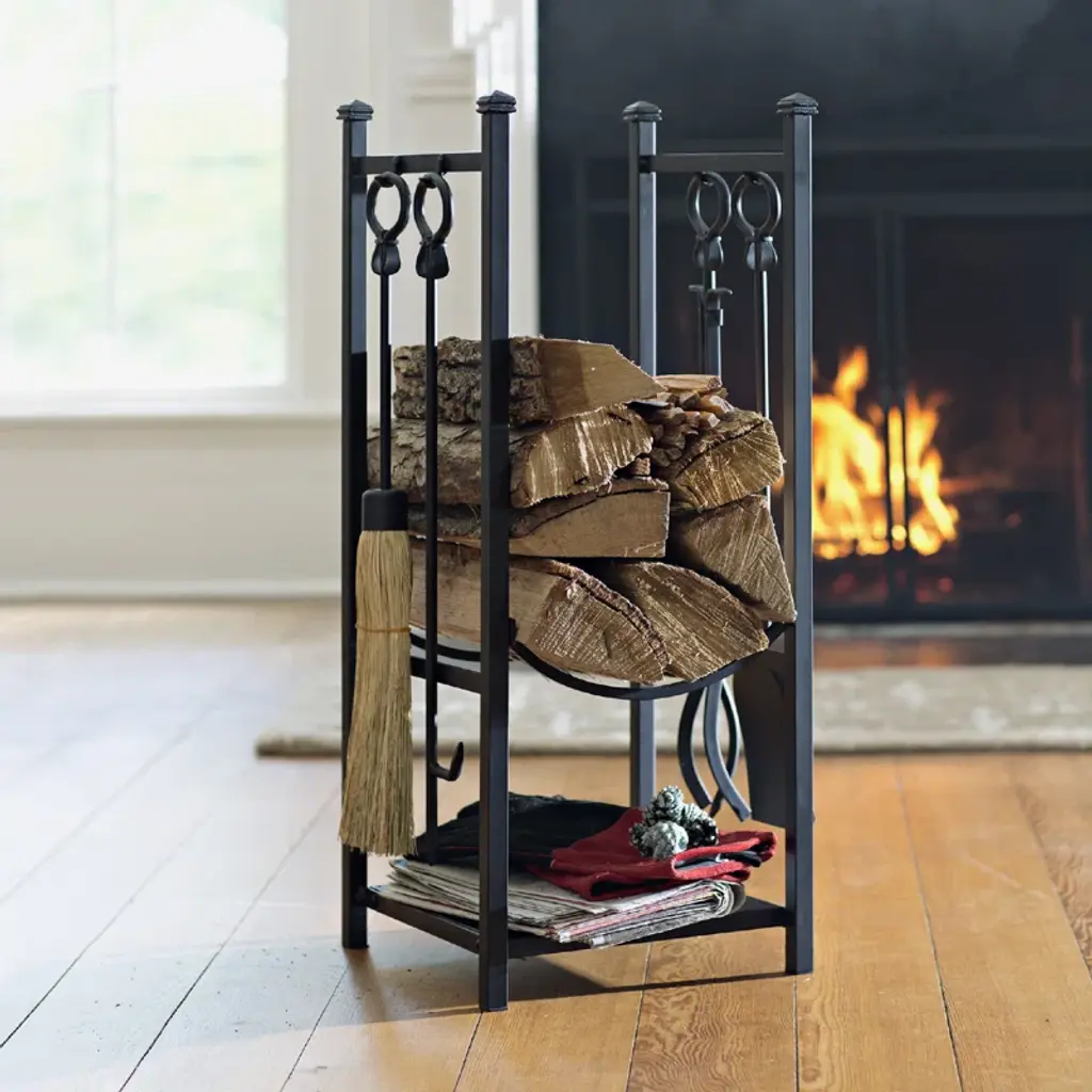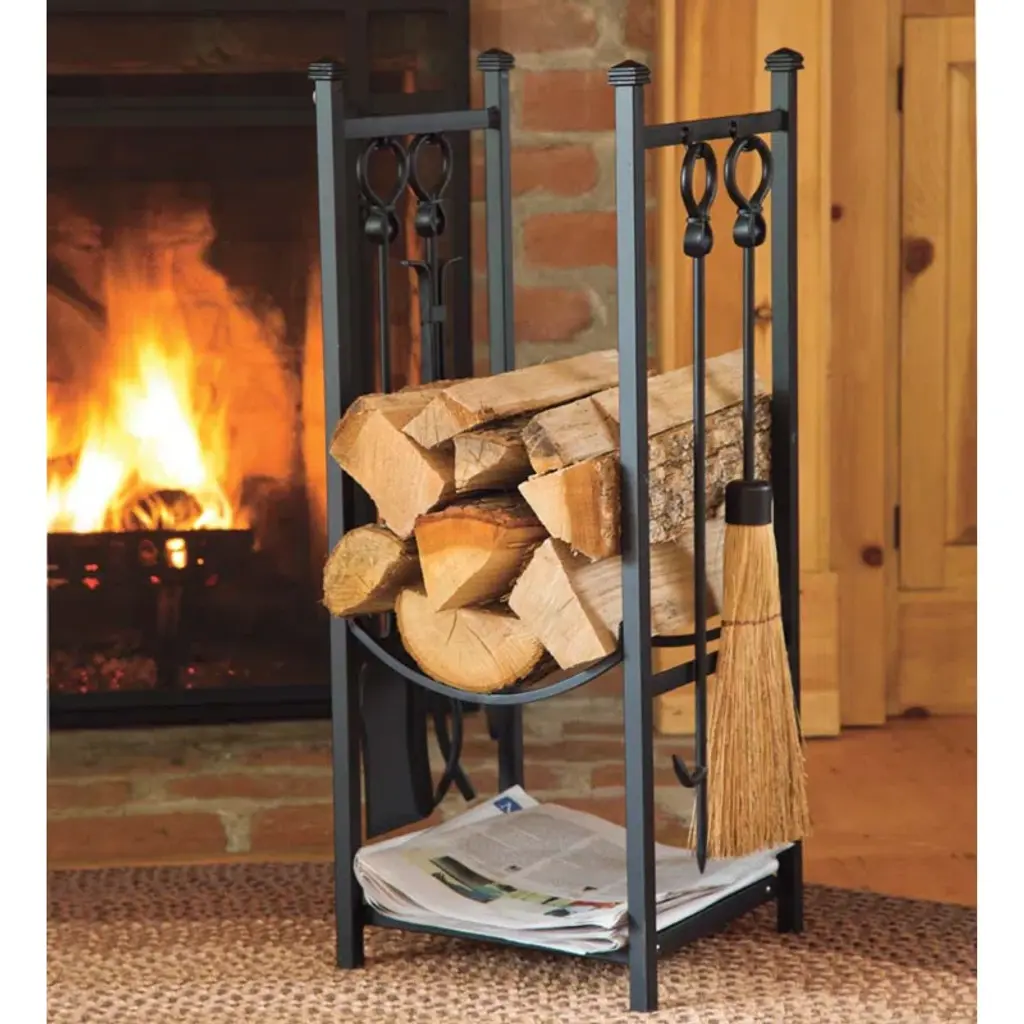 Keep your fireplace organized and cozy with this compact log rack and toolset combo. Designed to hold logs, kindling, and newspapers, it's both handsome and functional. Made from heavy-duty steel with a black powder-coated finish, this log rack is fade-resistant and includes a poker, broom, tongs, and shovel. Ideal for any hearth, its space-saving design is perfect for keeping your fireside essentials in one neat package. A great gift idea and a fantastic value, this indoor wood rack is the ultimate hearth solution.