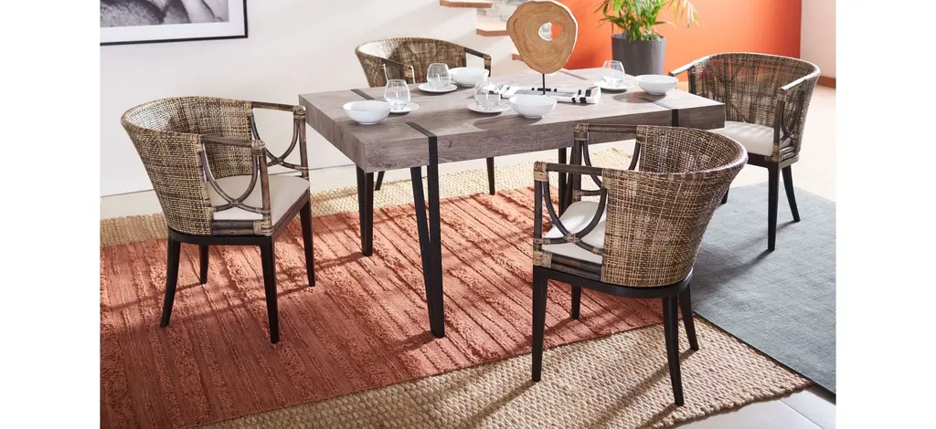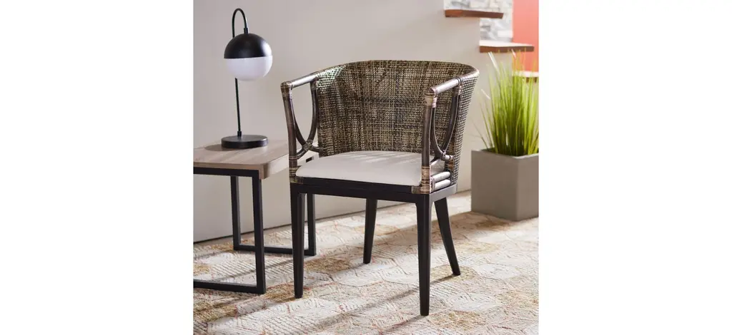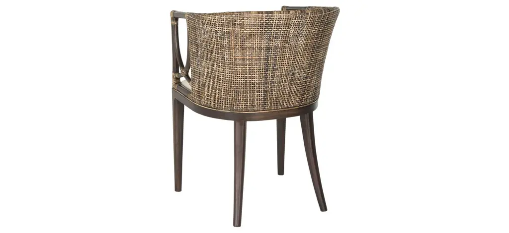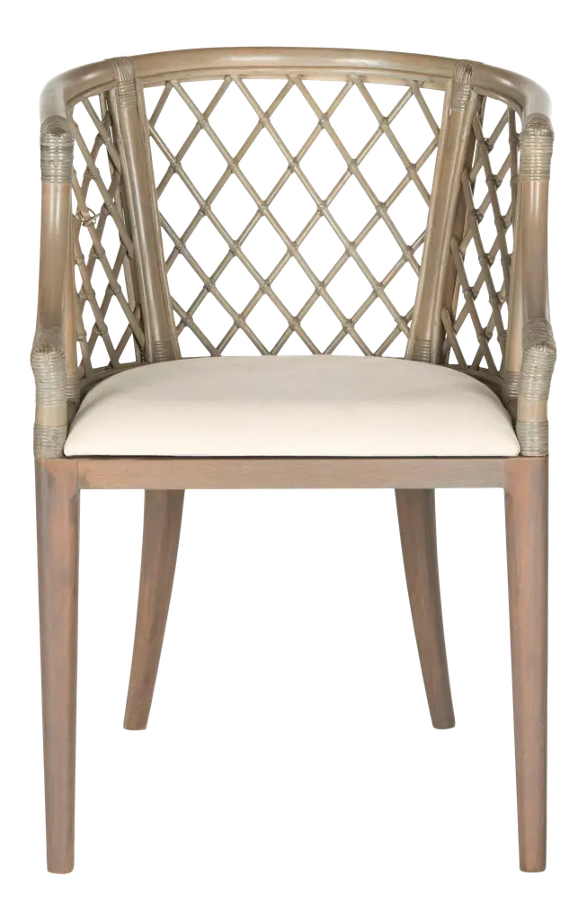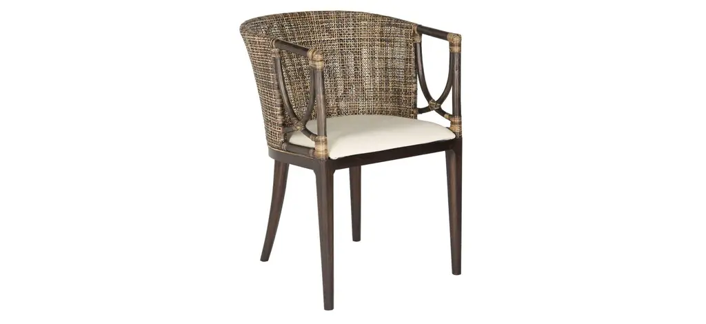 Inspired by the aesthetic melange of Buenos Aires at the peak of modernity, the Bette Arm Chair with white cotton cushion is pure sculpture. Its exquisite rattan back with classic arm detail is accented with rugged rawhide and black mahogany legs.