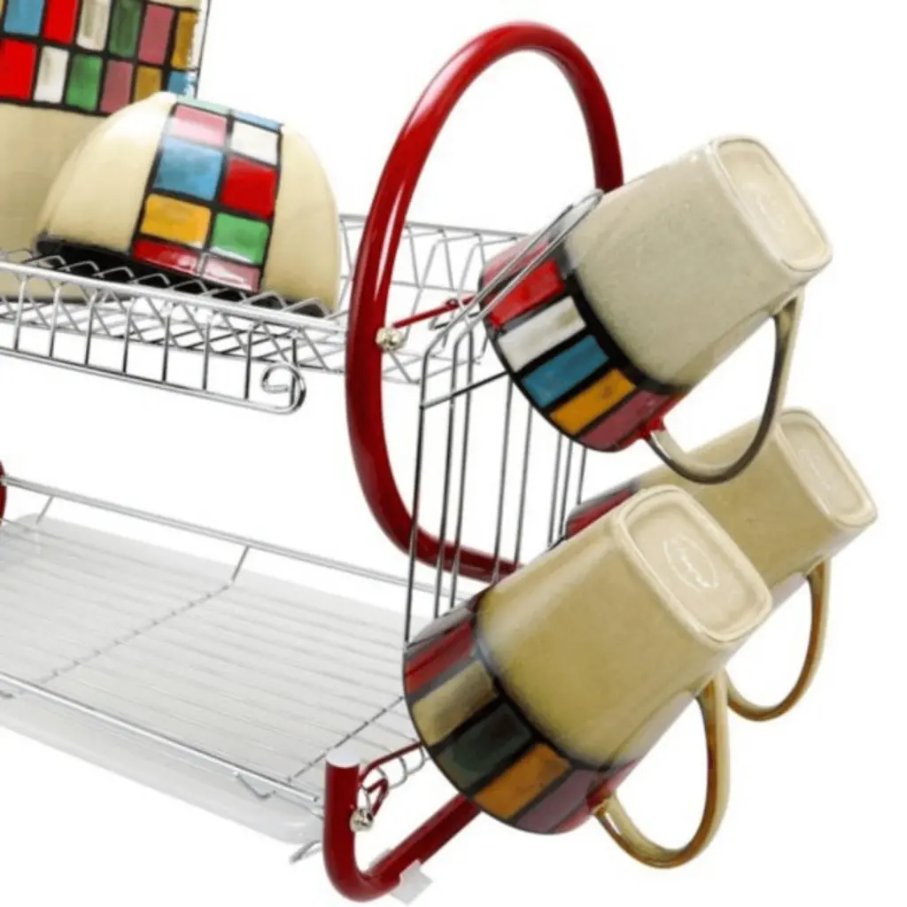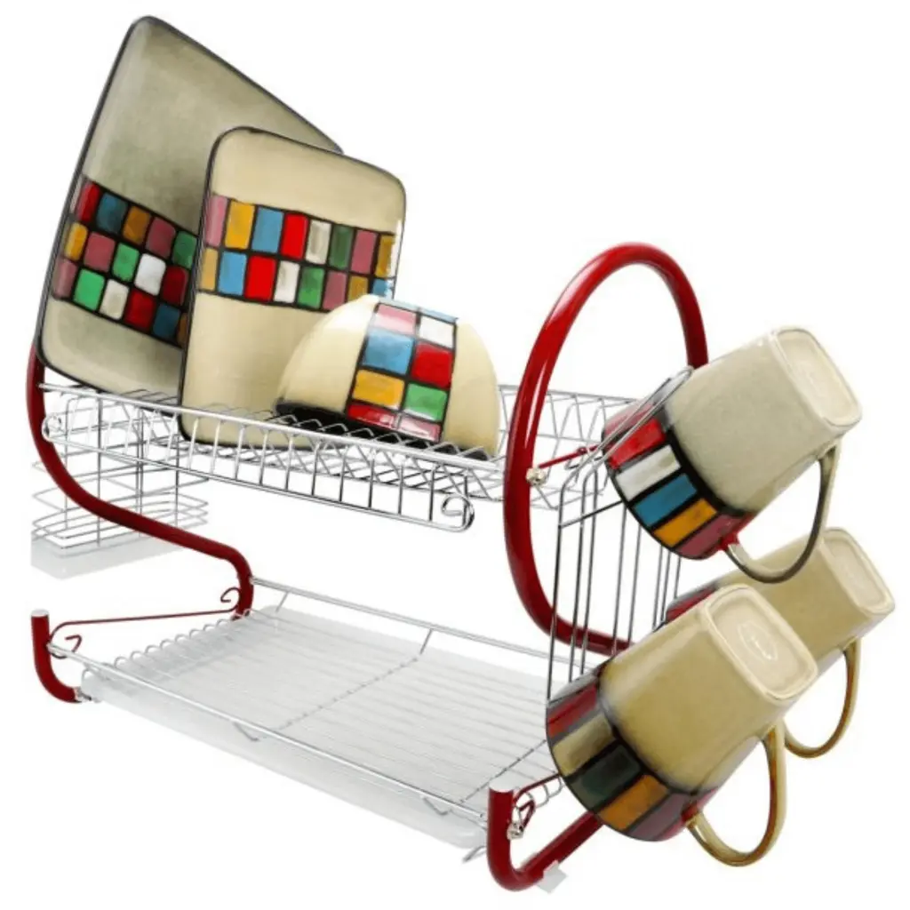 Better Chef 22" 2-Level Colored-Chrome-Plated S-Shaped Dish RackDescriptionThe Better Chef 22-inch 2-level colored-chrome-plated dish rack comes with convenient side-mounting mug stand and cutlery holder attachments for added versatility. Its metal construction boasts an attractive chrome plating for both durability and aesthetic appeal. Equipped with non-marring silicone-coated feet protectors, it ensures stability while safeguarding surfaces from scratches. Additionally, the rack includes a plastic draining tray, mug stand, and cup holders for efficient organization. With the capacity to hold up to 23 plates or bowls, it offers ample space for drying various dishes.Features and Specifications:Product Information: