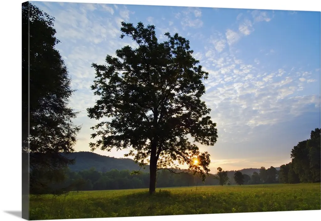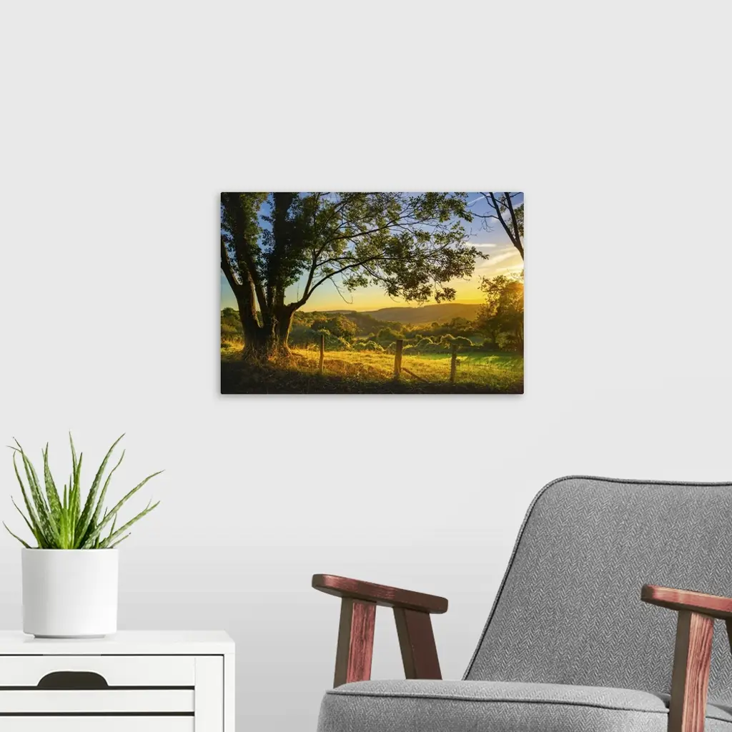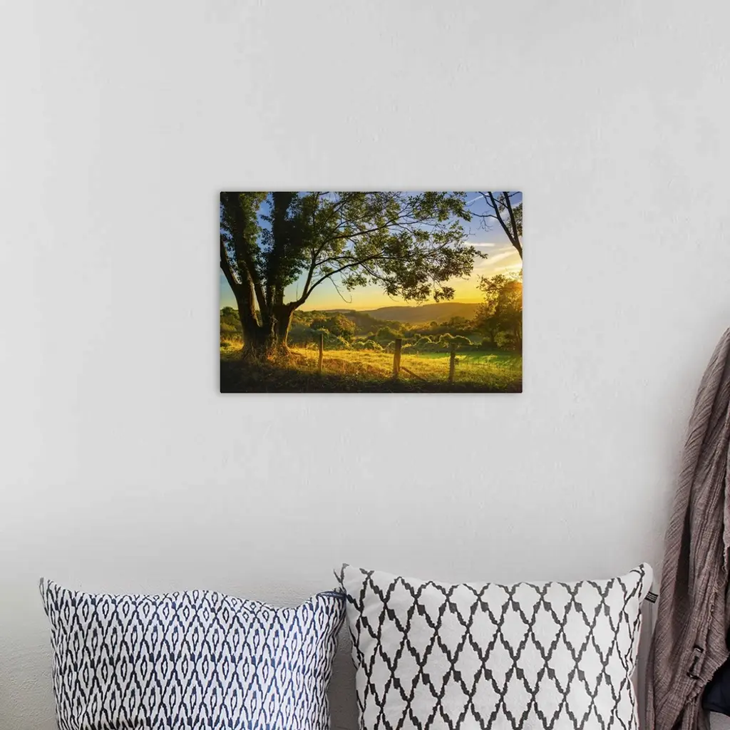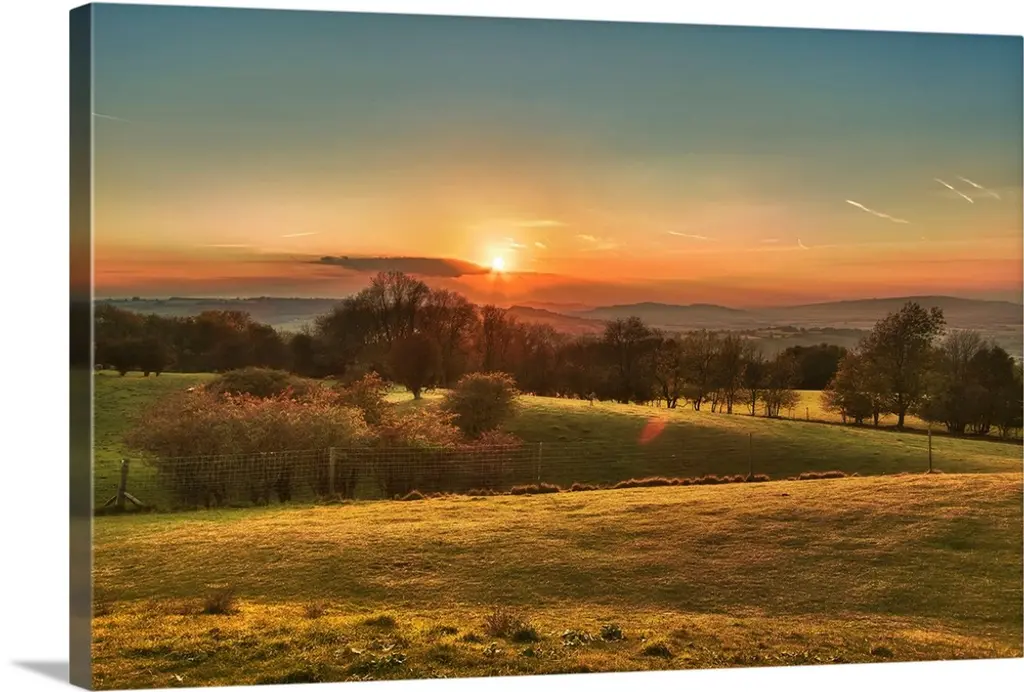 The South Downs in West Sussex at dusk with yellow light cast across farm fields with ancient hedgerows and a silhouetted tree.