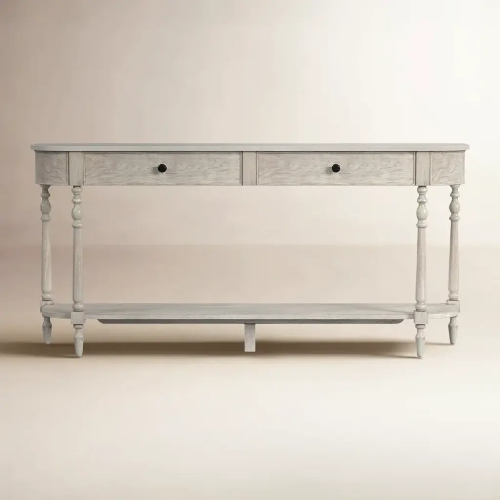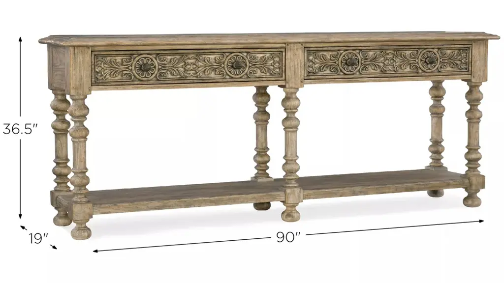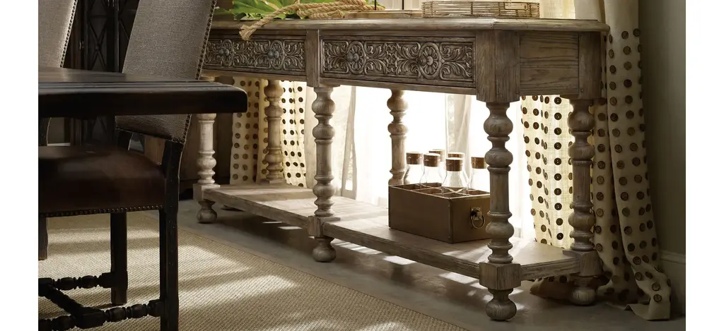 The striking Bexar Leg Huntboard is crafted in a carved gambel oak motif inspired by the scrub oaks that are prominent in the American West. The Sandstone finished with characteristic aged black highlights is reminiscent of the sandstone quarried in Texas Hill country for centuries. The huntboard has one fixed wood shelf and two drawers.