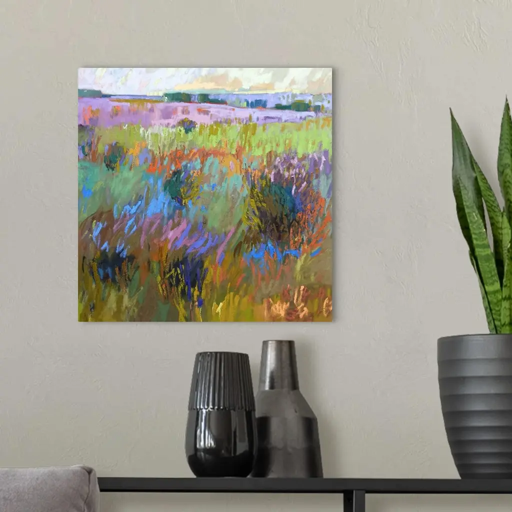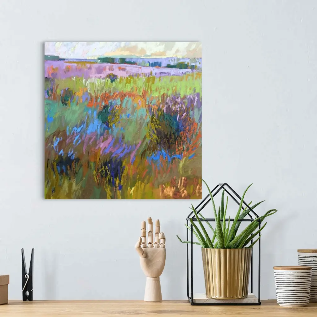 A square abstract of a field with flowers painted with brush strokes of vibrant colors.