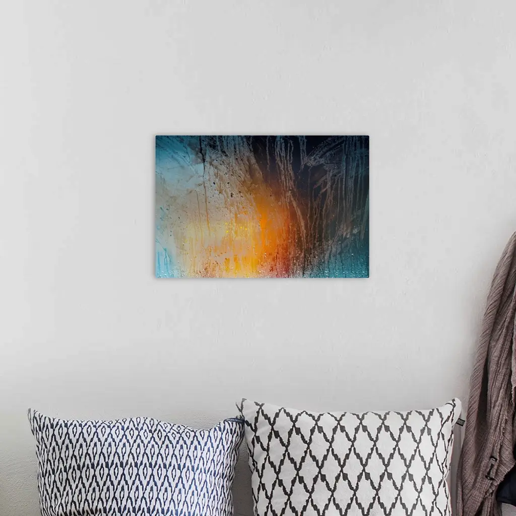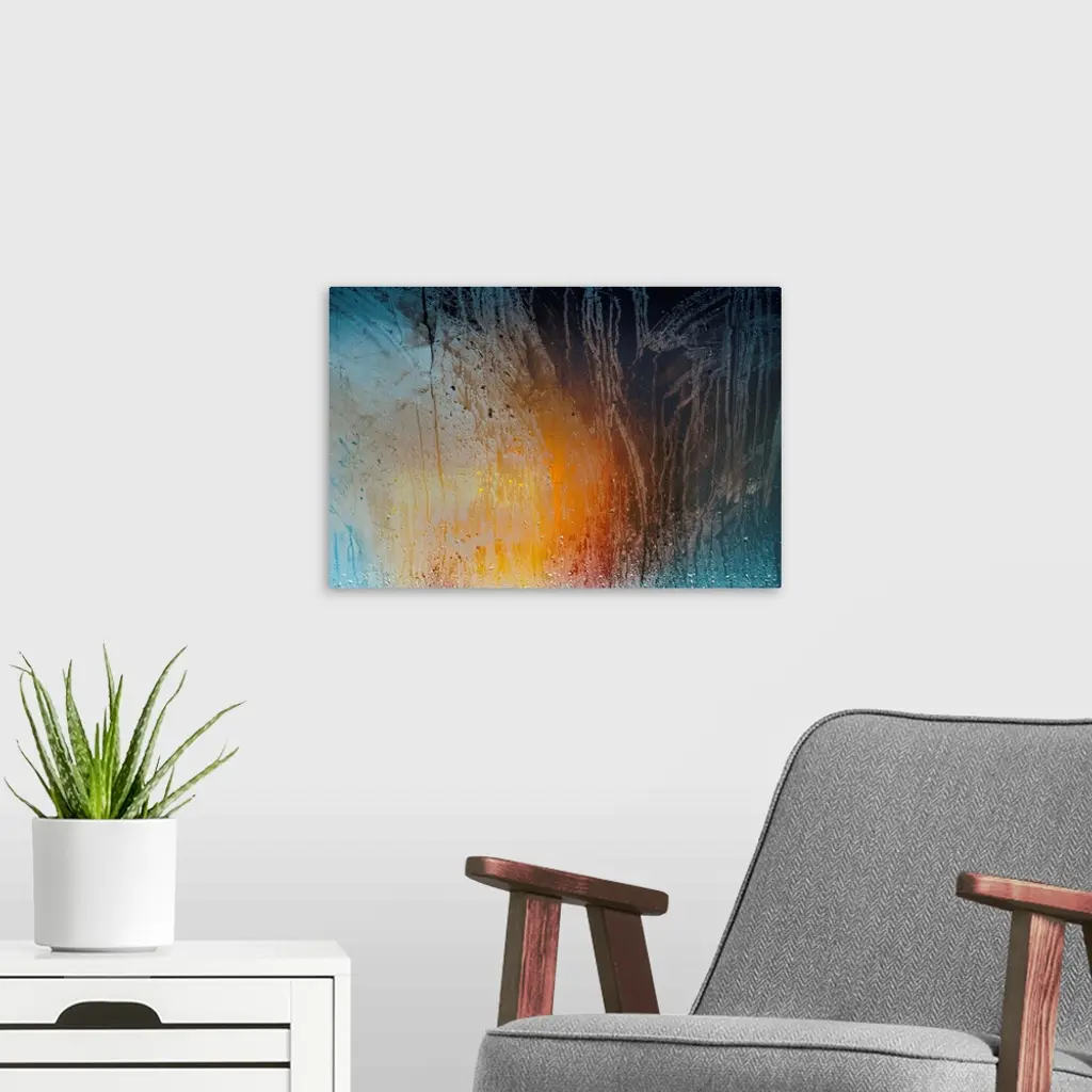 Fine art photograph of colorful lights shining on a foggy and wet window with beads of water running to the bottom.