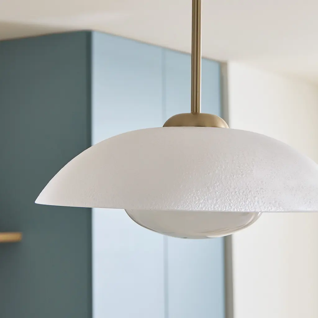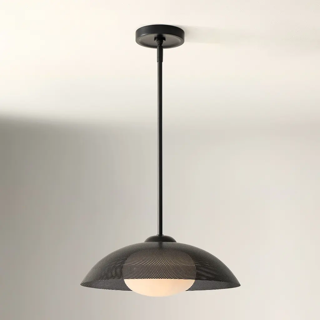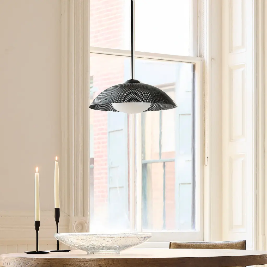 A textured disc makes a bold backdrop against the light. Choice of sand-blasted glass or perforated metal shade. Perfect for the kitchen, living room or dining room. Contract Grade for unmatched durability.