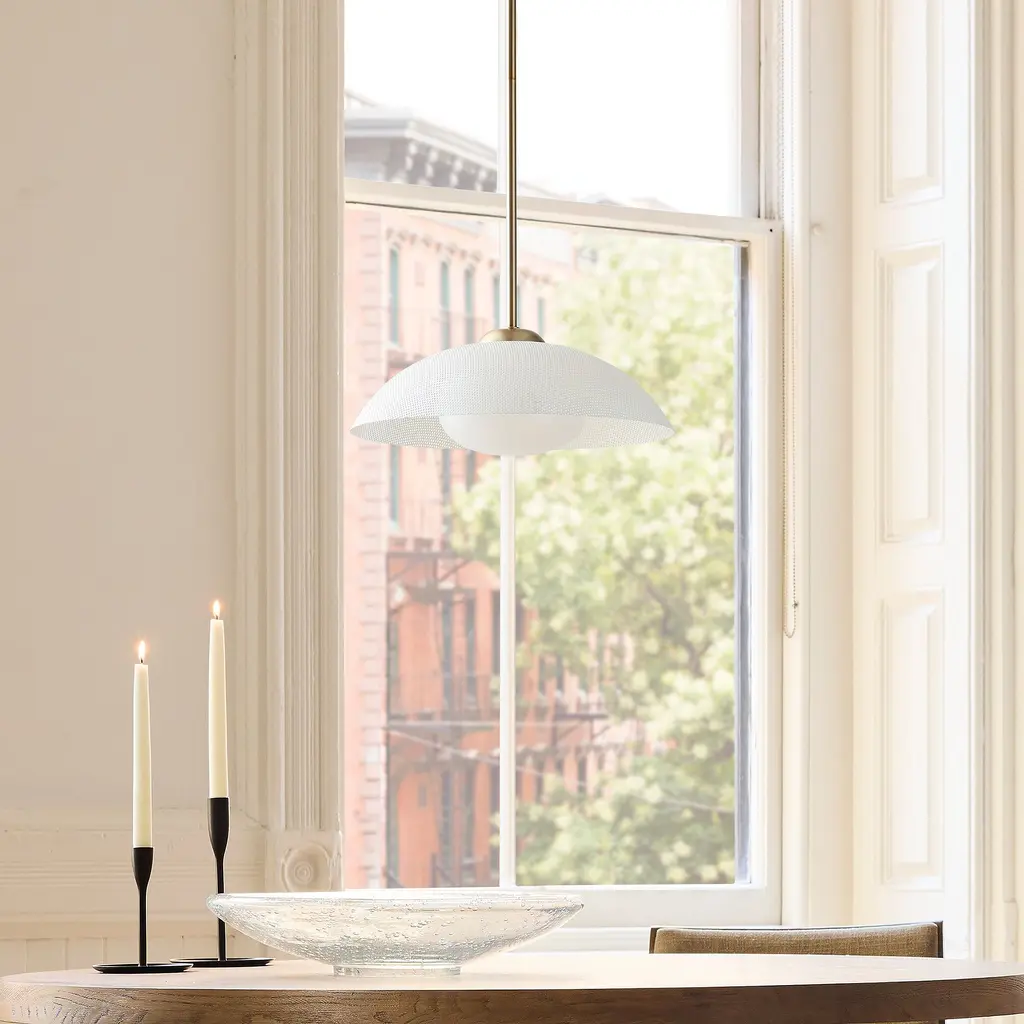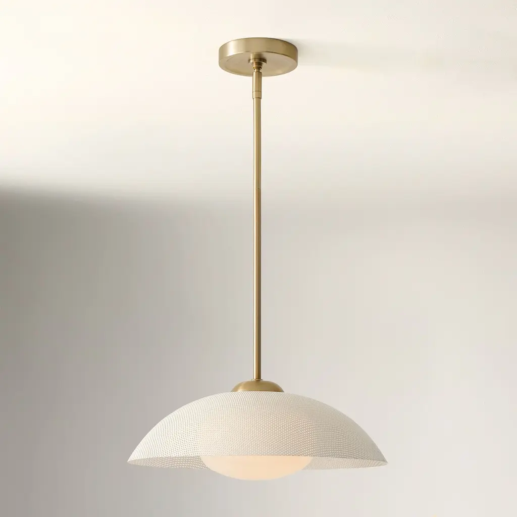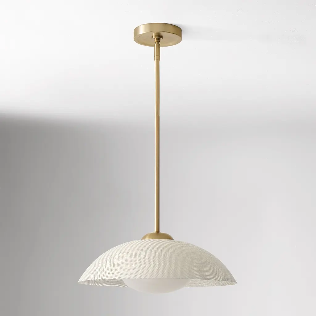 A textured disc makes a bold backdrop against the light. Choice of sand-blasted glass or perforated metal shade. Perfect for the kitchen, living room or dining room. Contract Grade for unmatched durability.