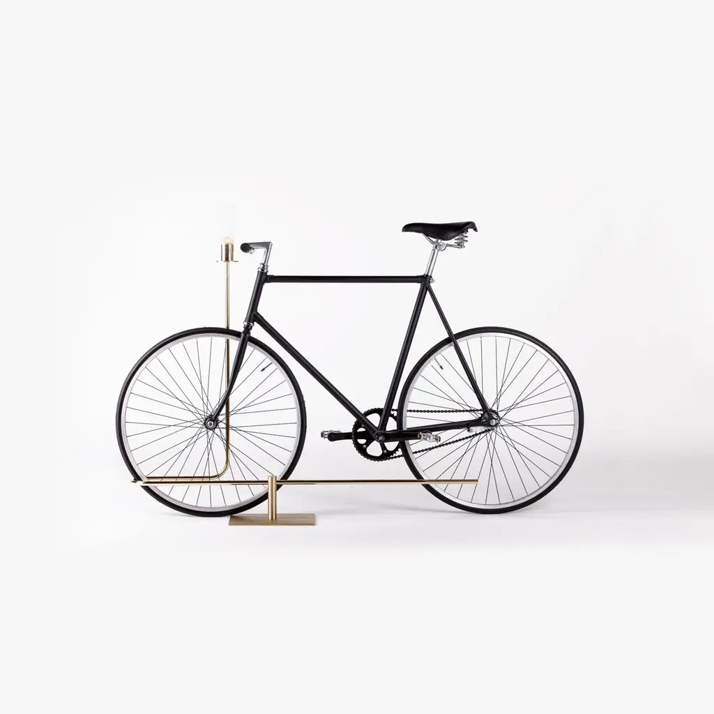 Bi-Track parking stand by MingardoDimensions: D123 x W14 x H121cm Materials: Varnished iron and LED lightWeight: 11 kgAlso Available in different finishes.All our lamps can be wired according to each country. If sold to the USA it will be wired for the USA for instance.Bi-track is a simple, brass-made parking stand for bicycles. It can be used in public and private spaces, recognizable as a sign and symbol. It is generated by one simple line and has a faint light at the end. Brass an texture will age with time, and match with every environment.Mingardo Ilario founded Mingardo Blacksmith Workshop in 1970, after over twenty years’ experience in the metal processing field.The production was initially focused on simple blacksmith works for the construction industry. Over the time, it has become more refined, enabling the company to collaborate with internationally renowned companies and architects: from the first collaborations with architect Carlo Scarpa to the more recent commissions for Museo del Novecento in Milan, Parco della Musica in Florence, and Teatro Petruzzelli in Bari.Over the years, the Workshop has achieved great results, with the production of unique metal products, all hand-wrought by a highly skilled team of specialized artisans. Nowadays, it is highly regarded in the local artisan field for its high-end refined finishing touches and details, and for its know-how