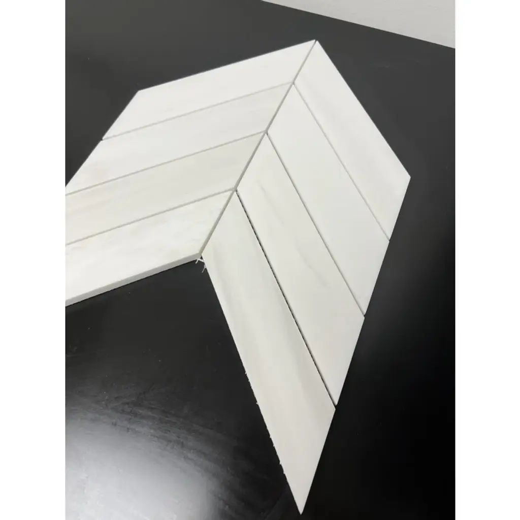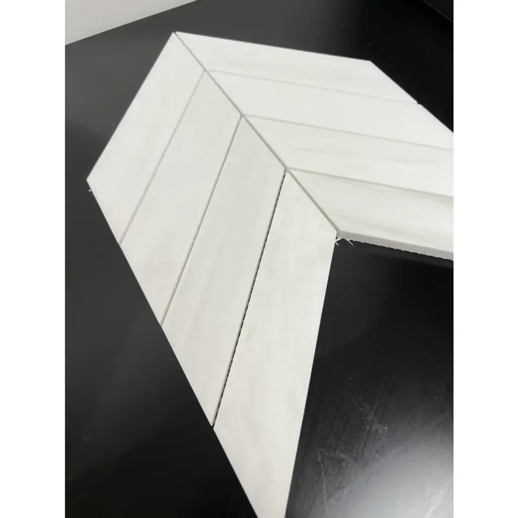 Featuring a stunning Bianco Dolomite Chevron, this aesthetic look mosaic can be used in many applications. Whether installed as flooring, backsplash or even a countertop, this mosaic is sure to bring style and elegance to your home. Polished/Honed finish made of natural stone and imported from Turkey with huge quantities. Able to shop containers if contacted directly