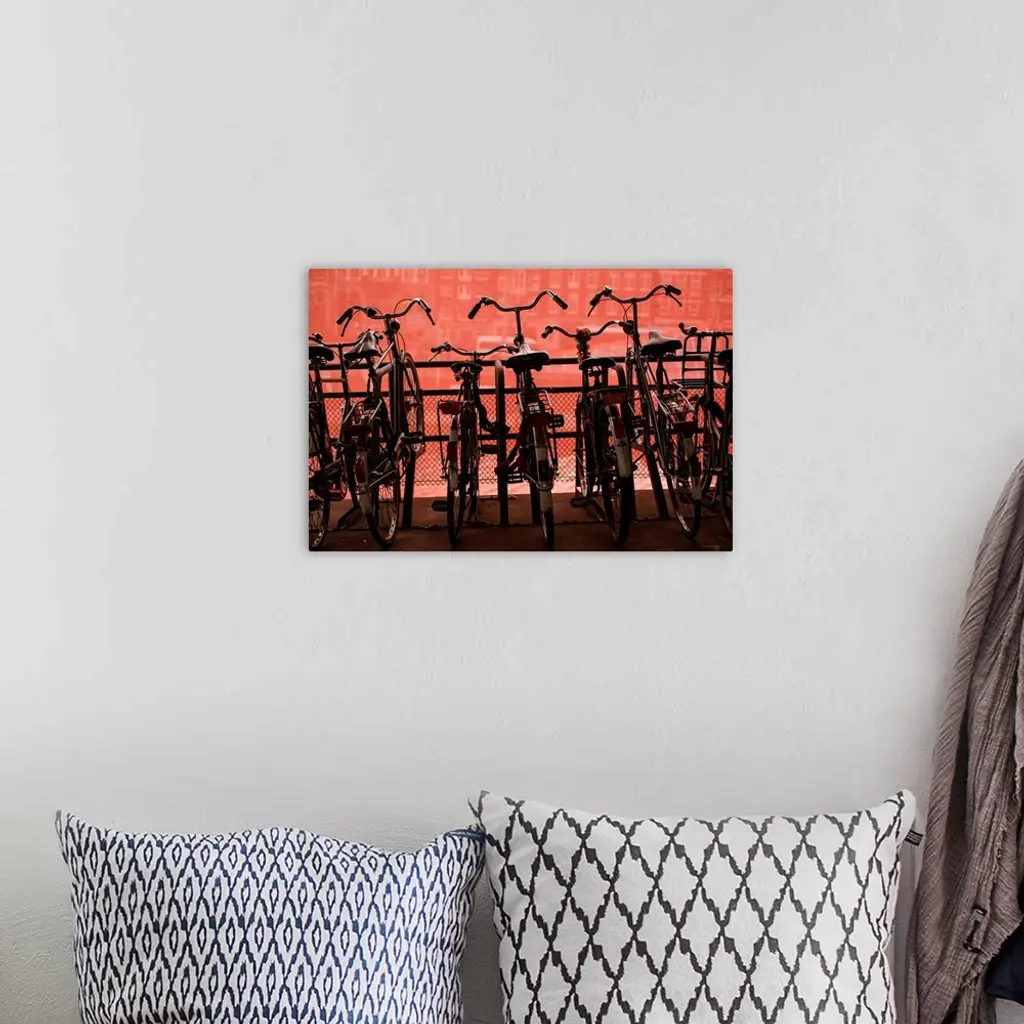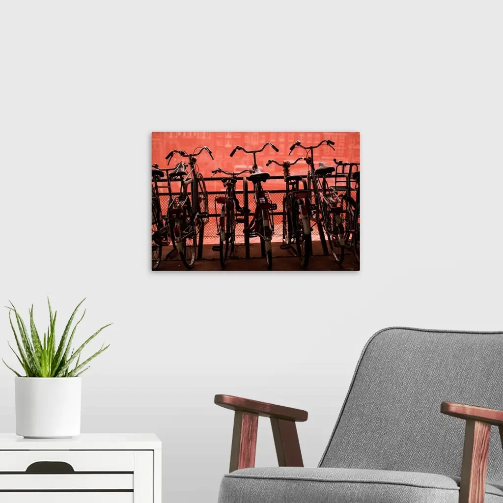 Several bicycles parked along a railing in front of a red wall.