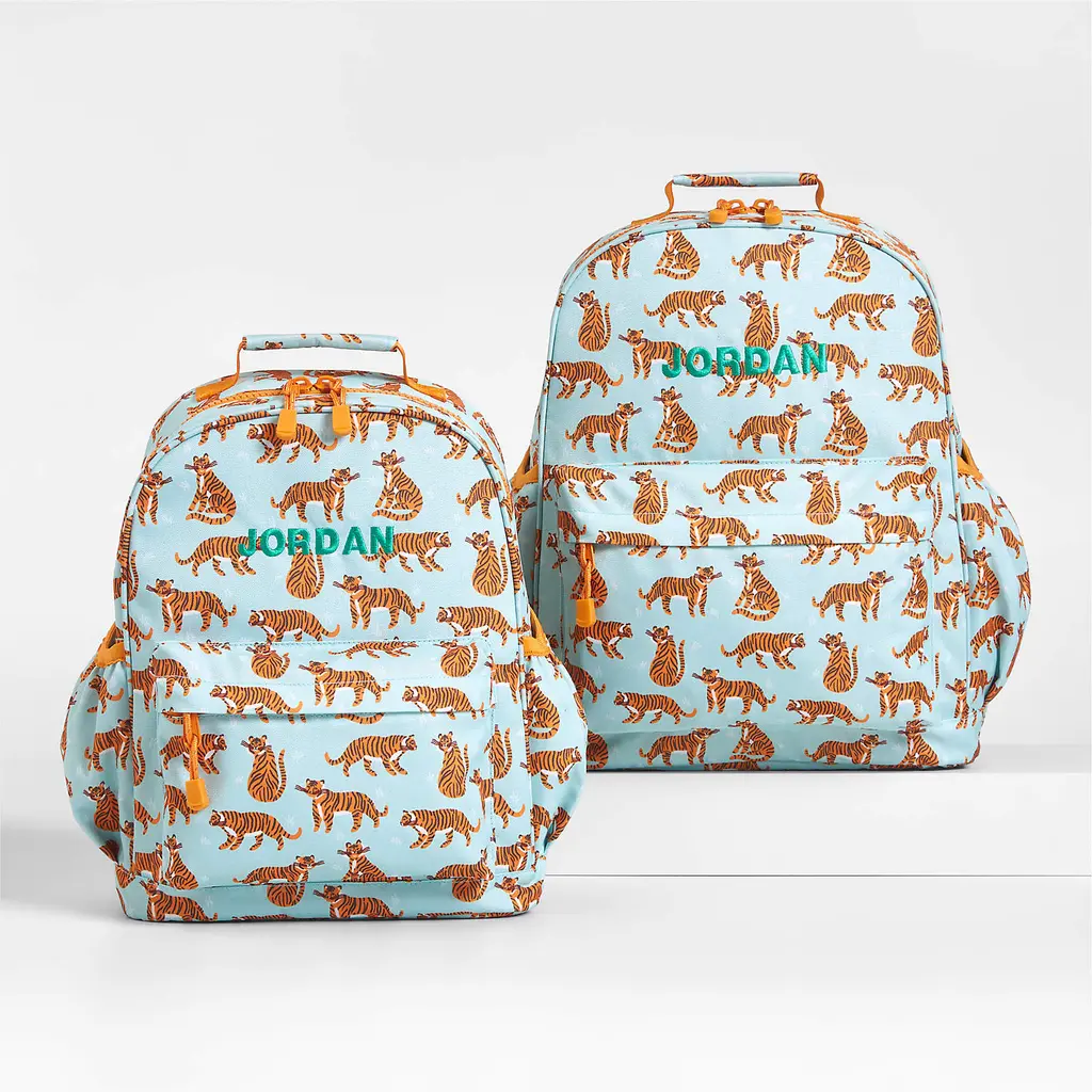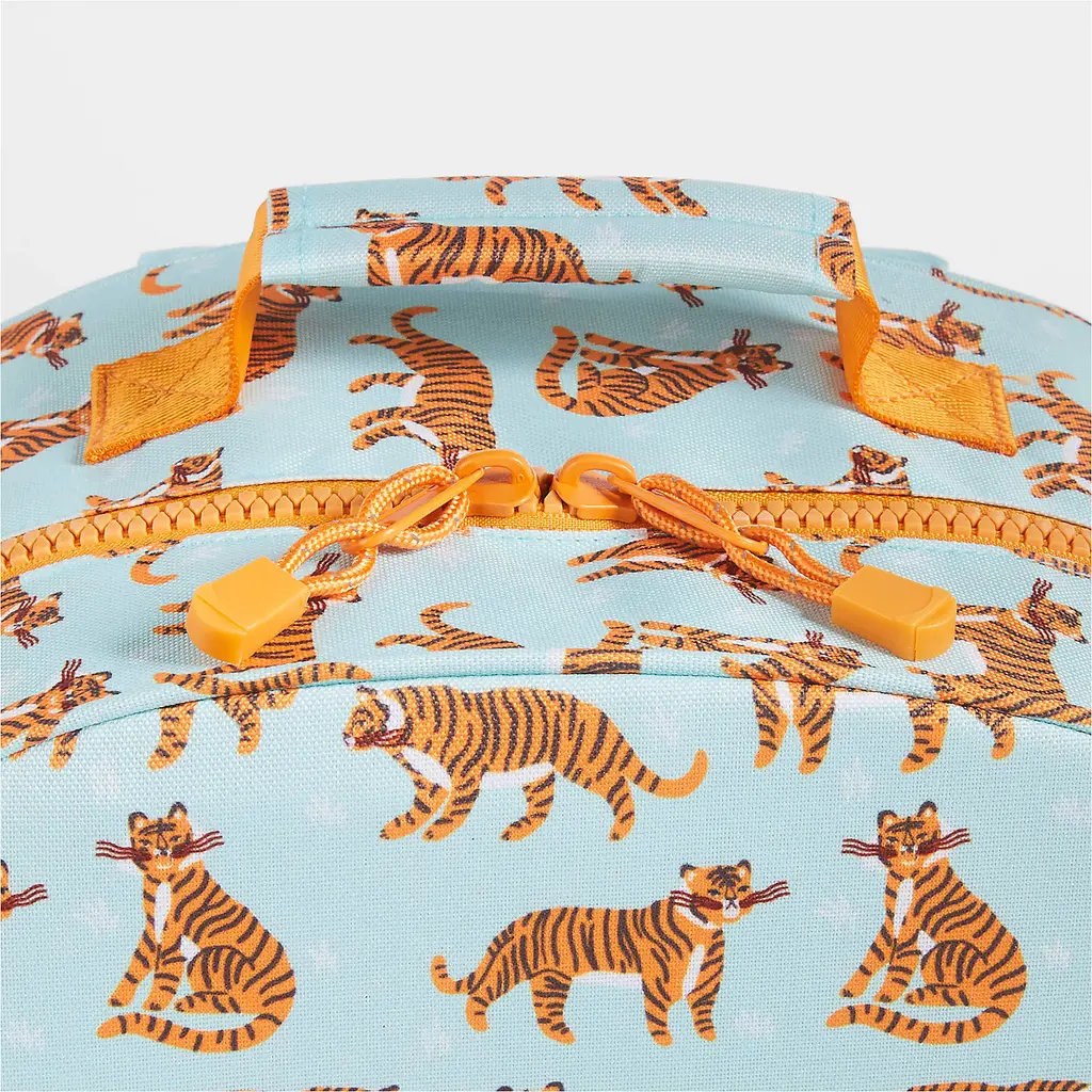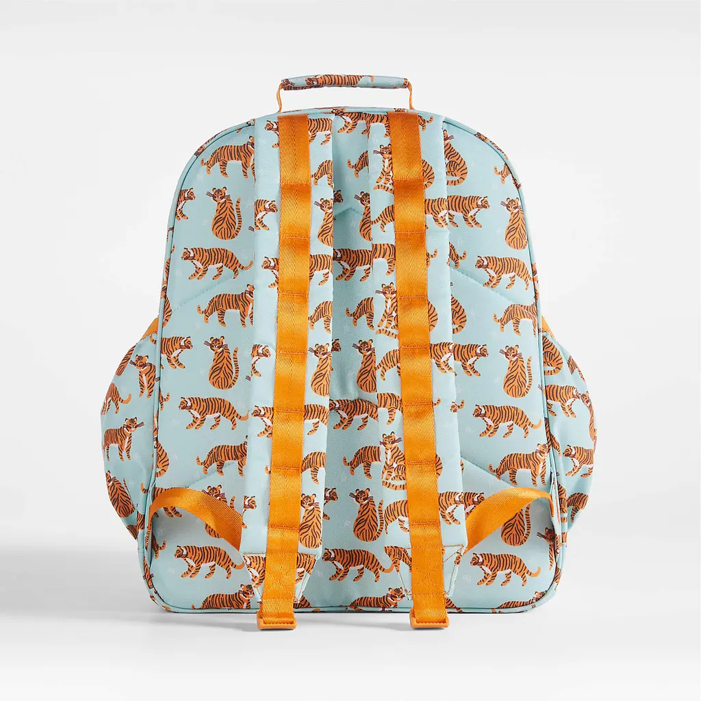 A backpack that's extra comfy and ready to handle a day in the wild. Patterned with a streak of friendly tigers on a light aqua blue background, the kids' large knapsack is constructed of supremely durable polyester made from recycled water bottles. A roomy interior holds everything your kid needs—books, school supplies, extra layers—and there's a padded pocket to keep their tablet protected. Outside pockets hold snacks, water bottles and more. For a purrfect combination, pair this book bag with the matching Big Cats water bottle and lunch box.