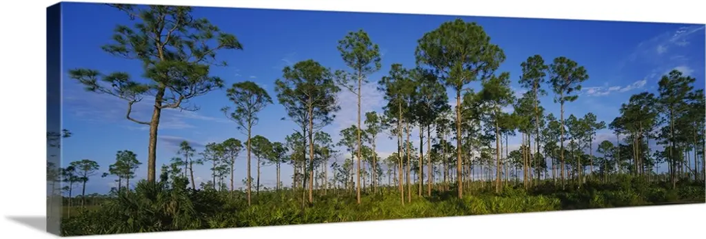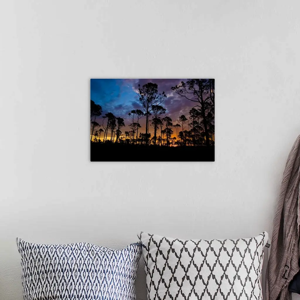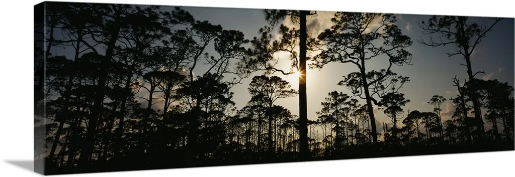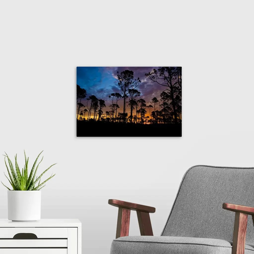 The rising sun silhouettes the slash pine trees in the foreground, looking east into the Big Cypress National Preserve; part of the National Park system in southwest Florida.