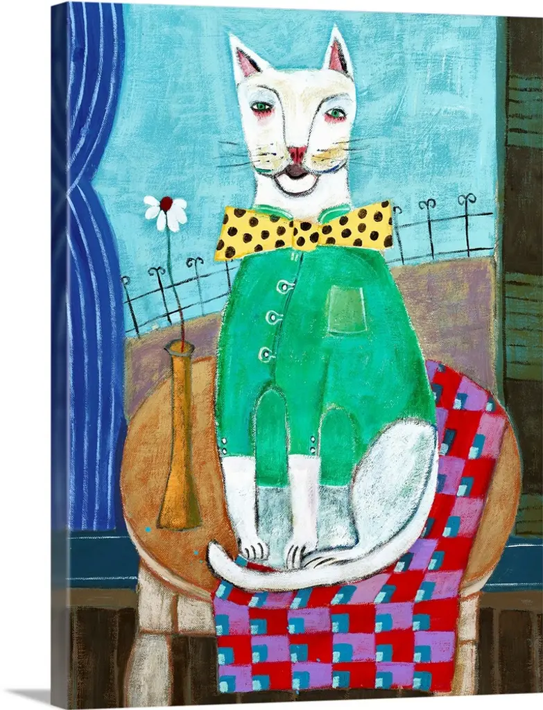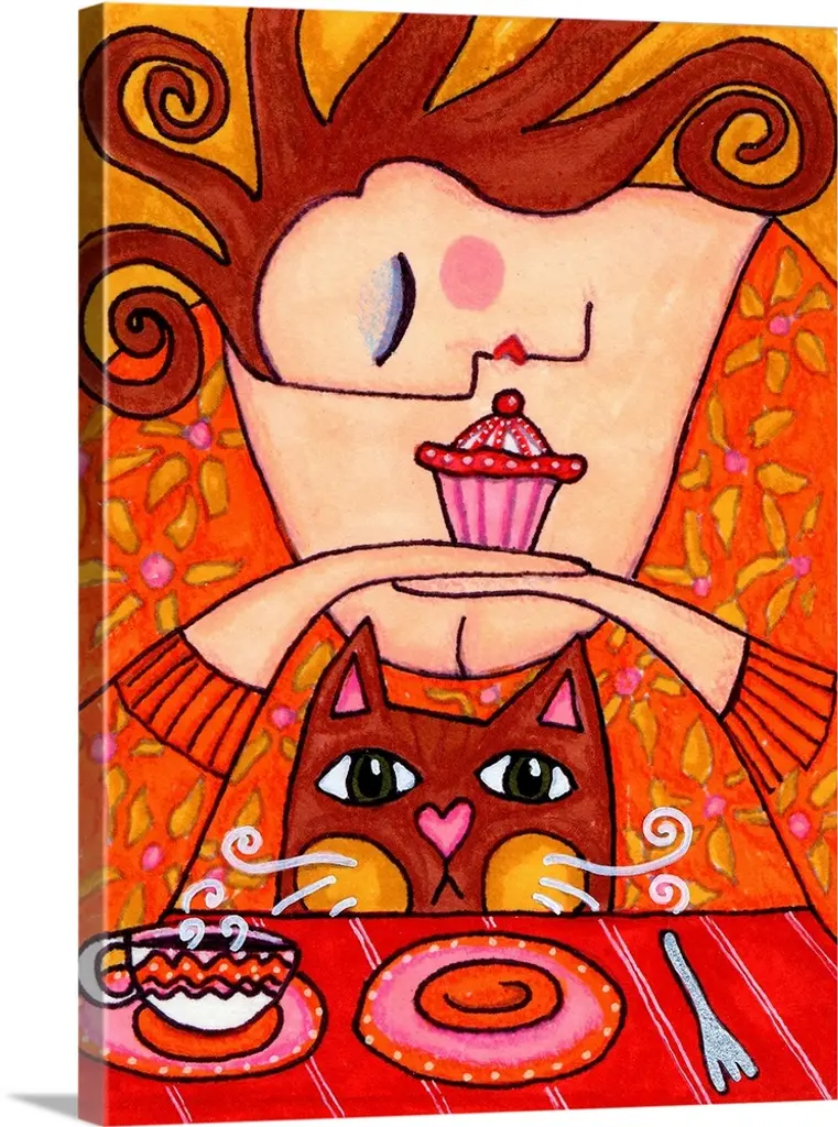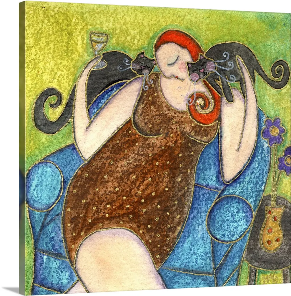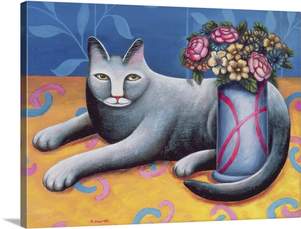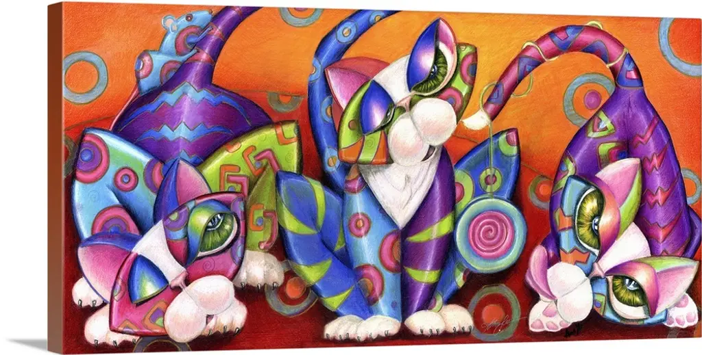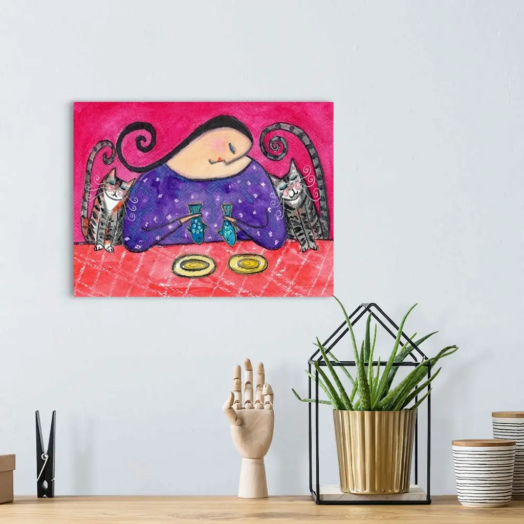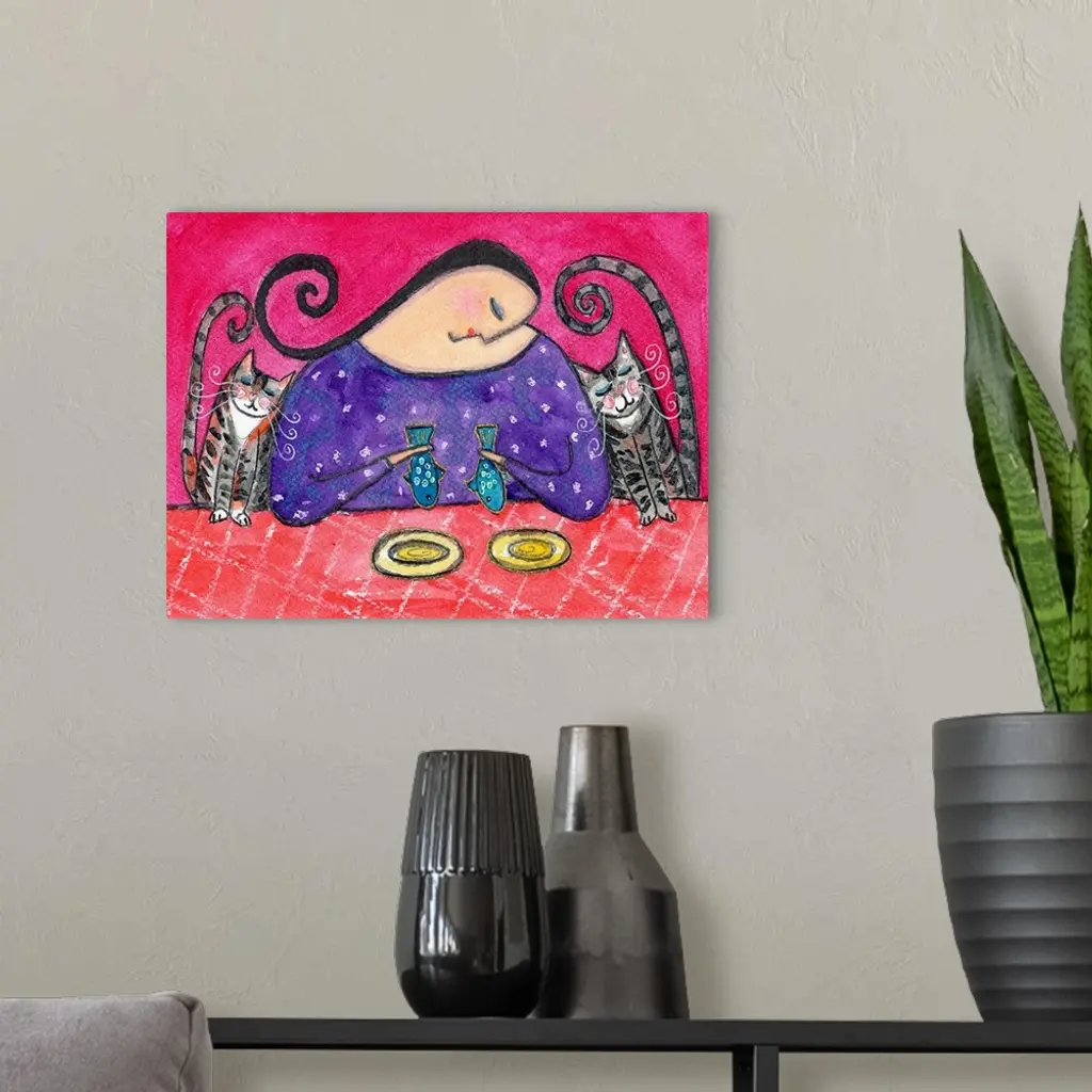 A woman in purple holding two fish with two grey tabby cats next to her.