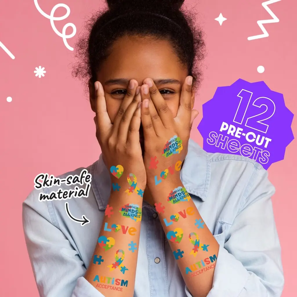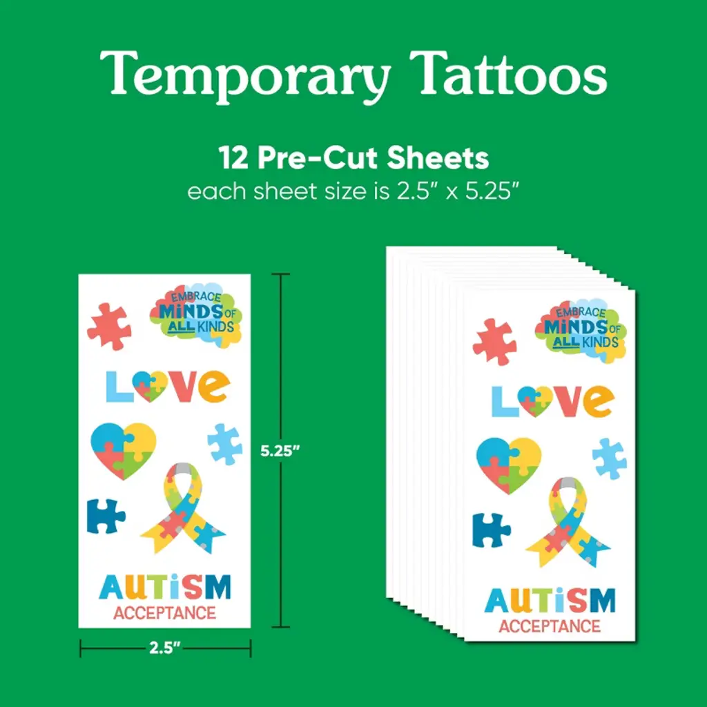 Wear Your Support: This set of Autism Acceptance temporary tattoos features colorful puzzle pieces and ribbon designs to promote awareness and inclusion. Pack includes 12 sheets of 8 tattoos for a total of 96 temporary tattoos. Fun for All Ages: Perfect for kids and adults alike—great for school events, advocacy walks, and sensory-friendly celebrations! How to Use: Grab your scissors and trim around the design you want. Remove the clear protective sheet and place your tattoo face down onto clean, dry skin. Wet paper backing with a damp cloth for 30 seconds. Then, peel off the paper backing and let your tattoo air dry. Use baby oil, makeup remover, or micellar water for easy removal. High-Quality: The colorful tattoo sheets are pre-cut and professionally printed on skin-safe material. Printed in the USA: Temporary Tattoos are designed and manufactured at our Wisconsin facility. Paper made in China.