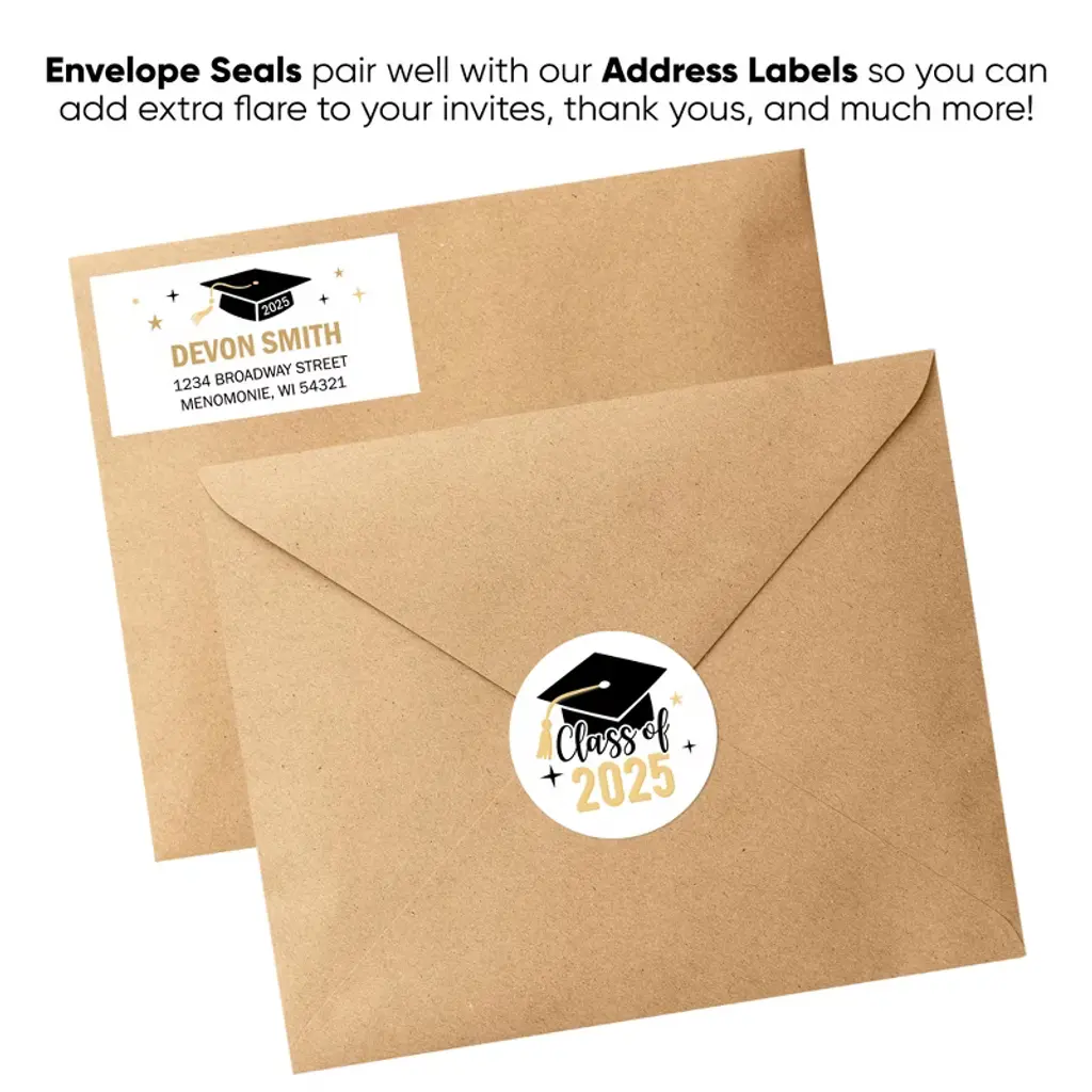 120 Graduation Envelope Seals: Add a polished (and adorable!) finishing touch to your grad party mail with our Class of 2025 Tassel Gold Graduation Envelope Seal Stickers. You'll get 120 round stickers (1.625 in. diameter) across 5 easy-to-peel sheets—perfect for invites, thank you cards, and graduation announcements. Grad Party Stickers: No more licking envelopes—ew. These envelope seals make your mail fun with school spirit while saving you time. Just peel and stick for a clean, secure seal that feels personal and grad party-ready. Tassel Gold Graduation Supplies: Sure, they're envelope seal stickers—but they're also super cute on party favors, food containers, gift bags, and more. Think beyond the mailbox! Easy Peel & Stick: Professionally printed on high-quality sticker paper, each envelope seal features a bold Class of 2025 design in Tassel Gold. At 1.625 inches round, these seal stickers are the perfect size to make a statement. Made in the USA: 2025 Grad Party Envelope Seals are designed and manufactured at our Wisconsin facility using materials that are proudly Made in the USA.