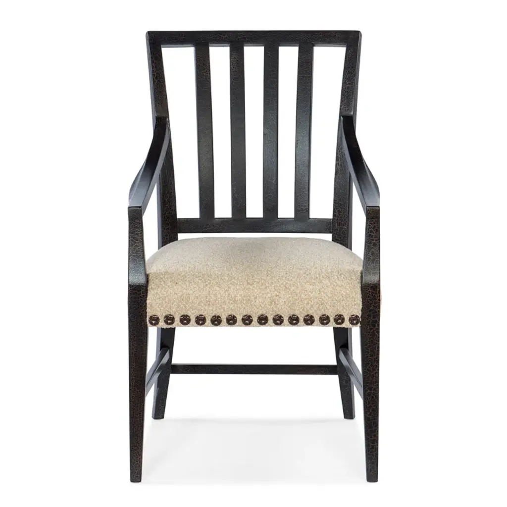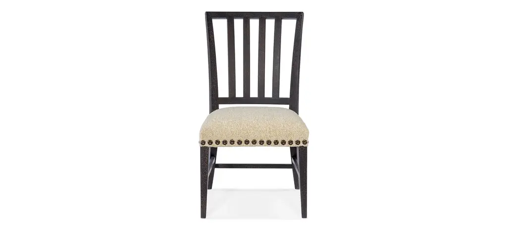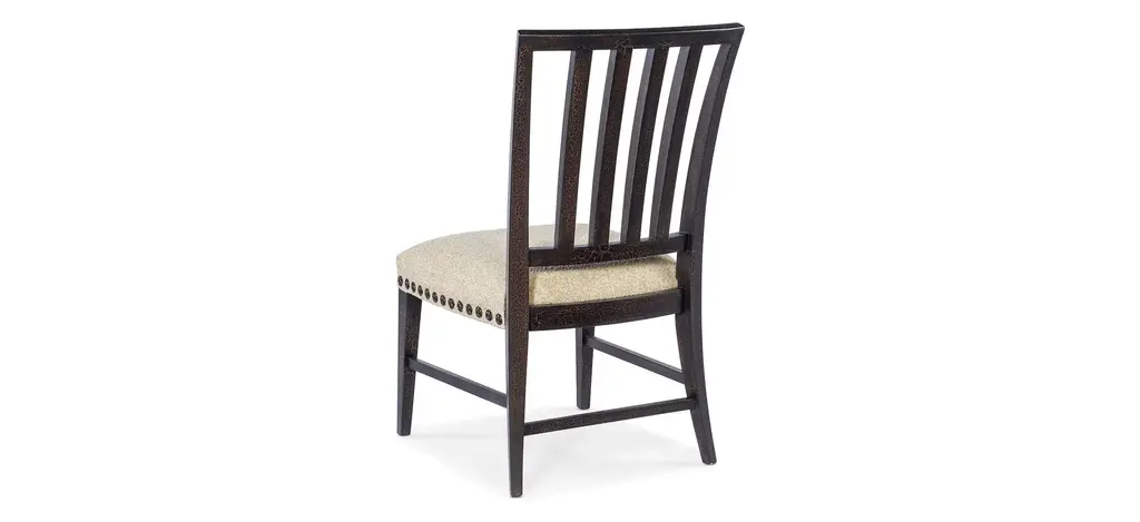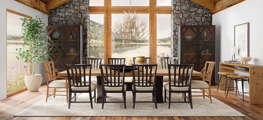 Inspired by the natural beauty of the American wilderness, the Big Sky Side Chair has a stylized spindle back, shaped wood legs, and 3 stretchers finished in charred timber.