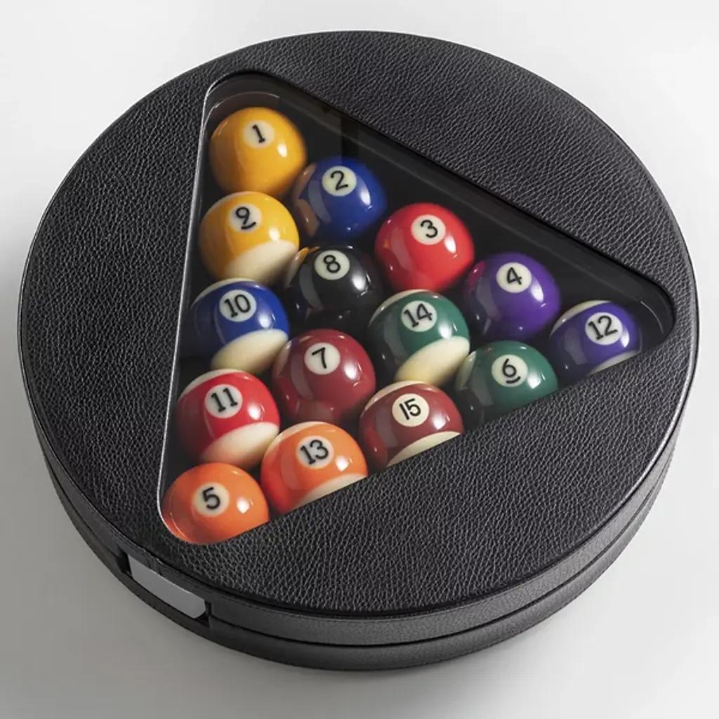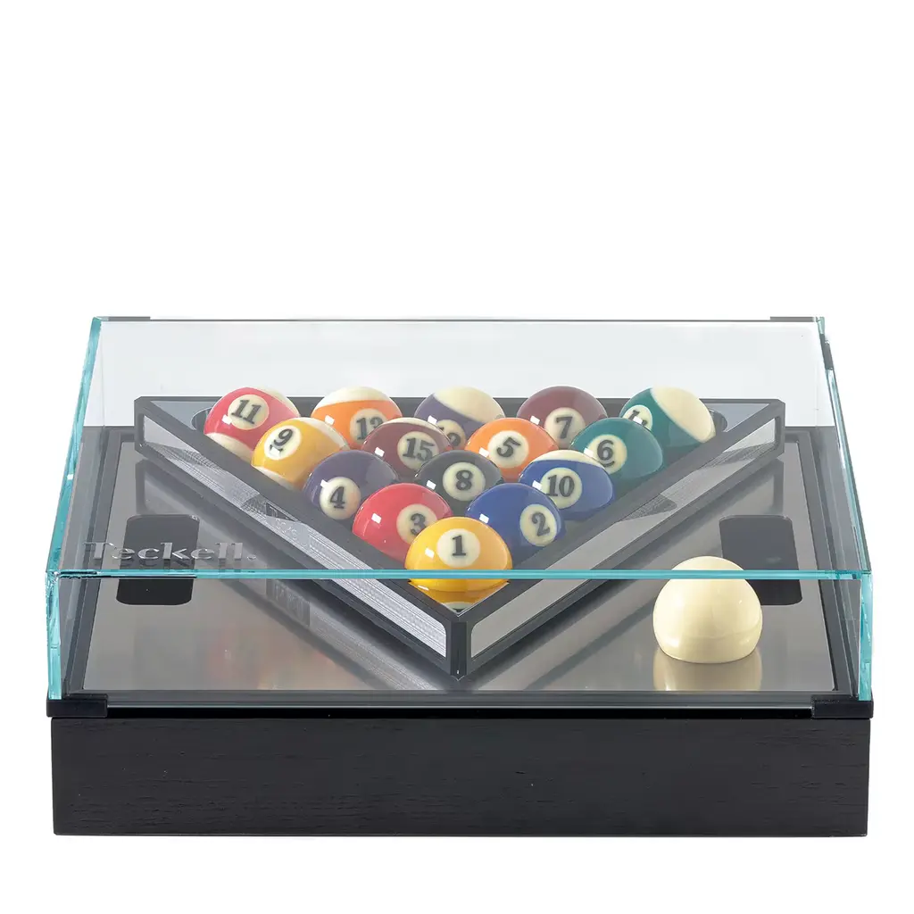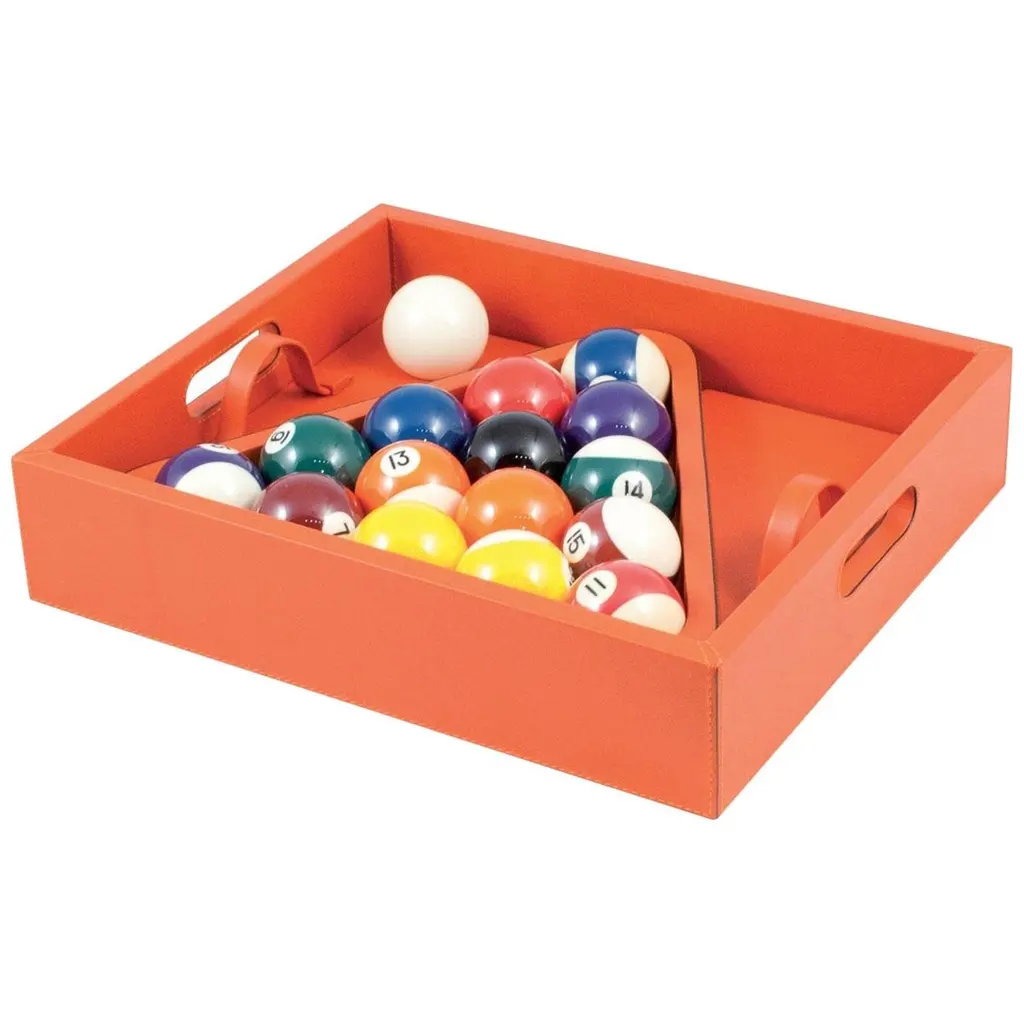 This striking case is an elegant addition to any playroom and will add a splash of color and sophisticated luxury to any home. The wood box is entirely covered in standard leather with a bright orange color. It features a handle for the box and one for the lid and, inside, is equipped with a leather-covered wood triangle and top quality professional 57.22 mm balls in phenolic resin by Aramith. The inside structure is removable, leaving an empty tray and a box. The color and texture of the leather can be customized. This piece is currently on show and immediately available at Artemest Galleria New York.