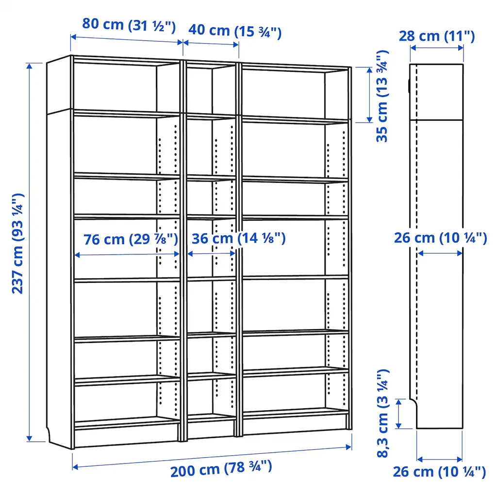 BILLY Bookcase comb w extension units - dark brown oak effect 78 3/4x11x93 1/4 ". BILLY is a versatile bookcase that works just as good as a storage unit and is suitable to use in many different ways at home. This bookcase has a height extension unit, allowing you to make the most of the wall area.