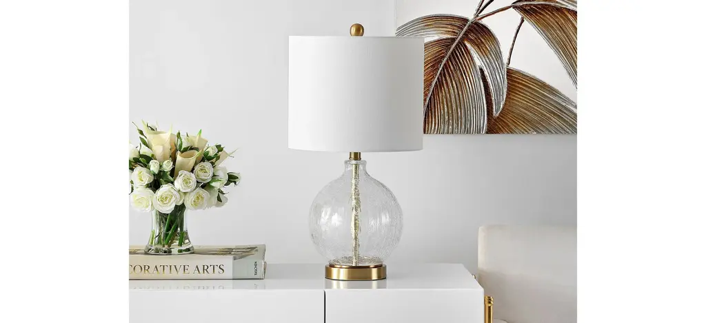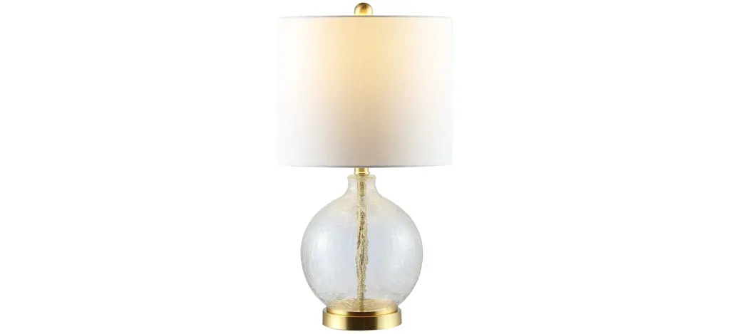 Bring a tasteful touch of sparkle to your d_cor with this Bilsor Glass Table Lamp. Bilsor's dramatically curved silhouette is given a glamorous shimmer with its clear seeded glass and smooth metal pedestal, while a white drum shade allows Lovell to seamlessly shine in any room.