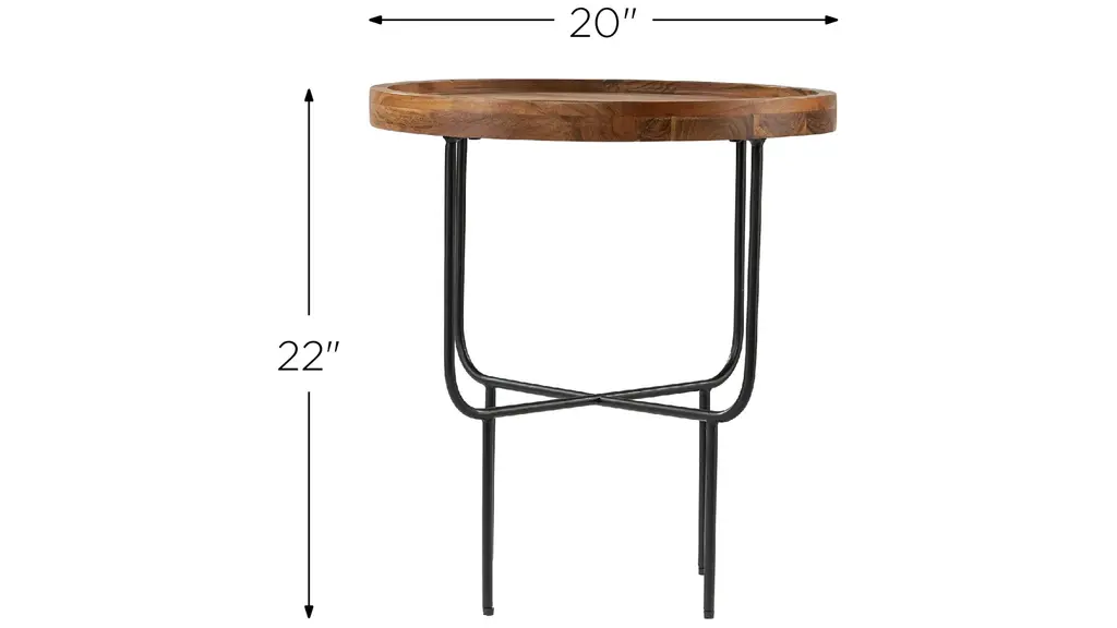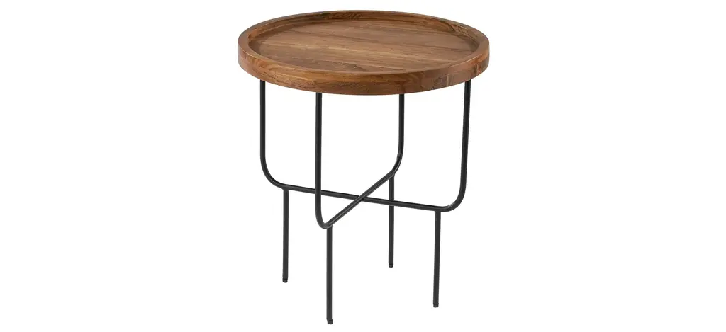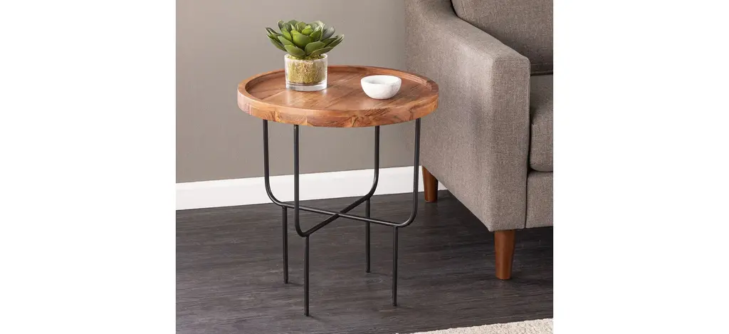 Modernize your farmhouse style with this Bilston Round End Table. A solid wood tabletop offers plenty of room for a lamp and your remote, while the raised, rounded edges create a tray-table look. The unique iron base adds a touch of whimsy, creating a light and airy feel. Your modern farmhouse style gets an elegant upgrade with this round side table in your living space.