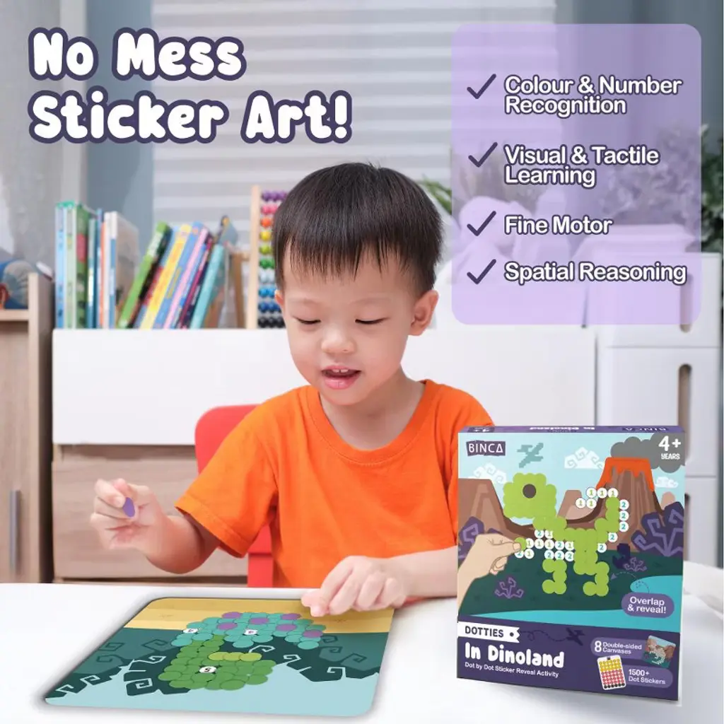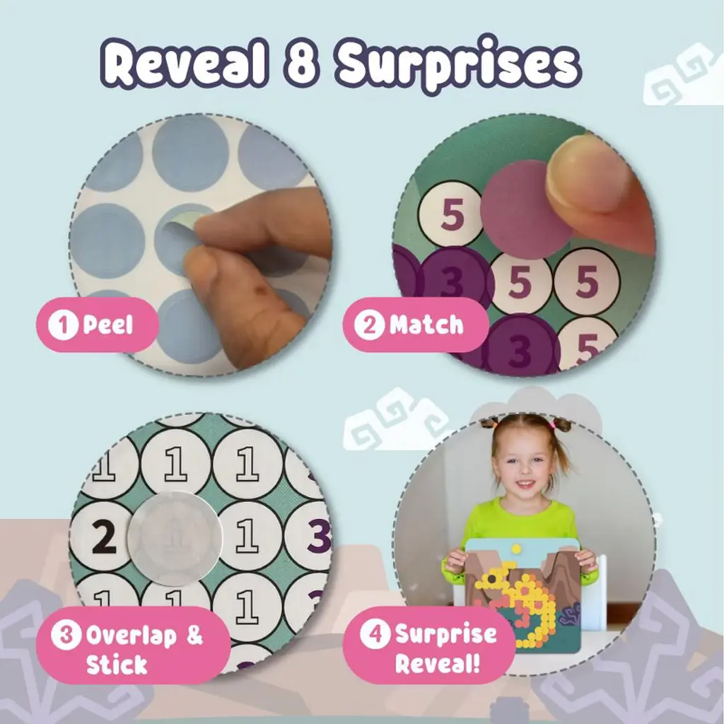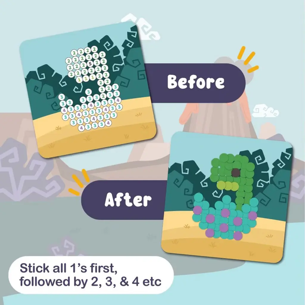 Reveal 8 magical prehistoric dinosaur surprises with this engaging sticker art kit for kids. With over 1,500 easy-to-peel stickers, it’s the perfect art & craft activity for little hands. This DIY sticker art project is an ideal peel and stick art kit that keeps kids entertained at home, during travel, or at playdates. Includes: 8 Double-Sided Canvases, 32 Easy to Peel Sticker Sheets (1500+ stickers) & 1 Rules Sheet.