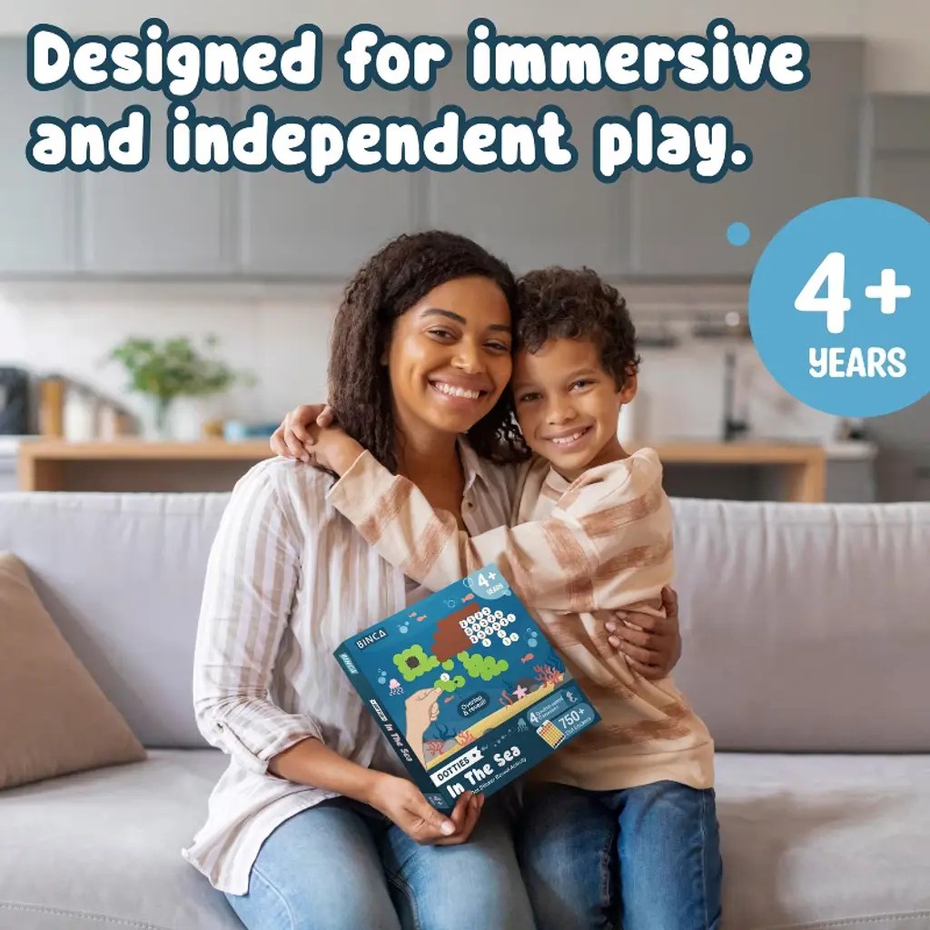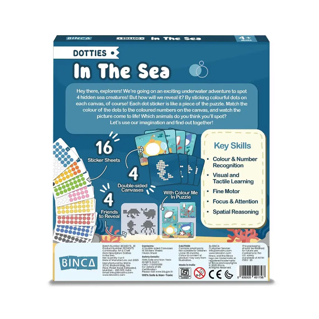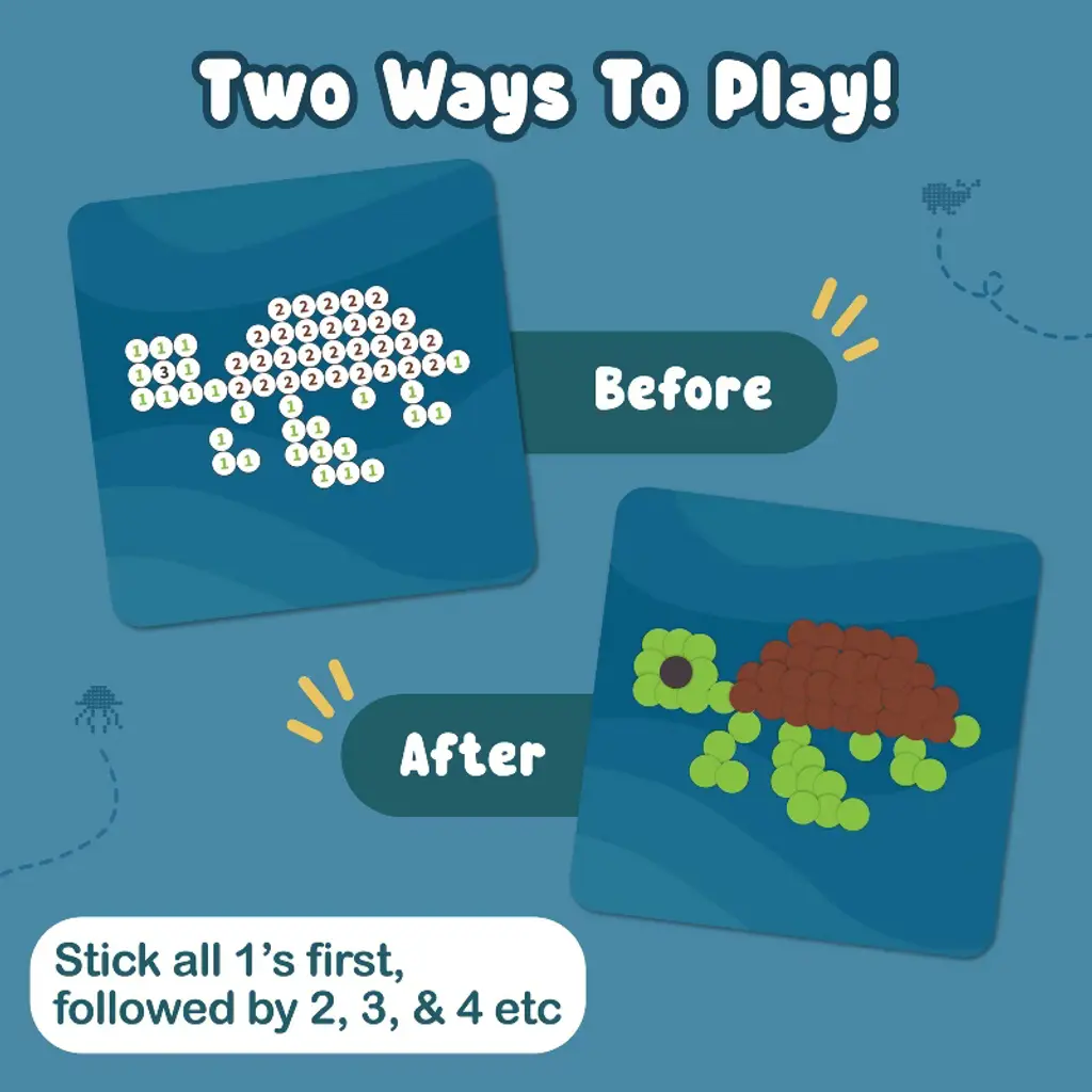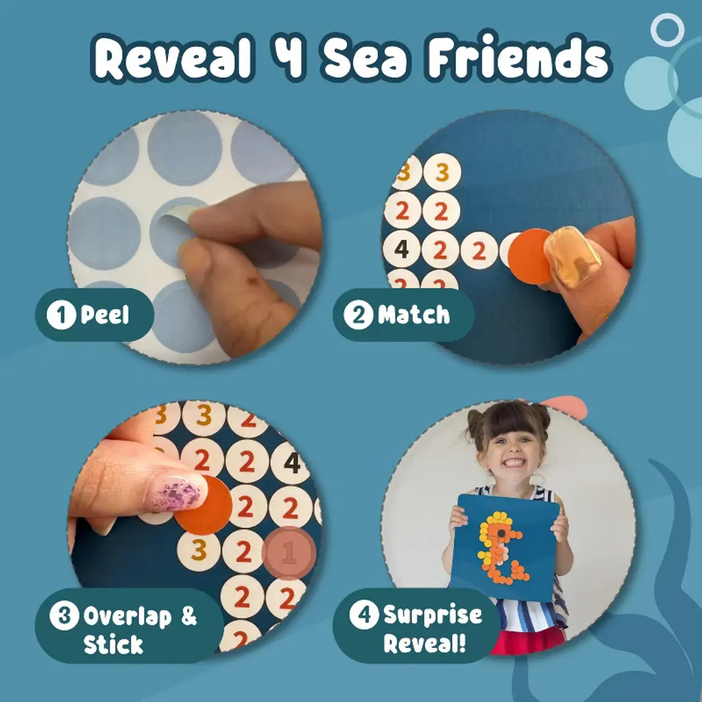Reveal 4 underwater animals with this engaging sticker art kit for kids. With over 750+ easy-to-peel stickers, it’s the perfect art & craft activity for little hands. This DIY sticker art project is an ideal peel and stick art kit that keeps kids entertained at home, during travel, or at playdates. Includes 4 Double-Sided Canvases, 16 Easy to Peel Sticker Sheets (750+ stickers) & 1 Rules Sheet.