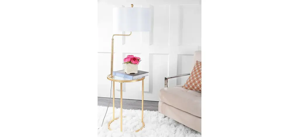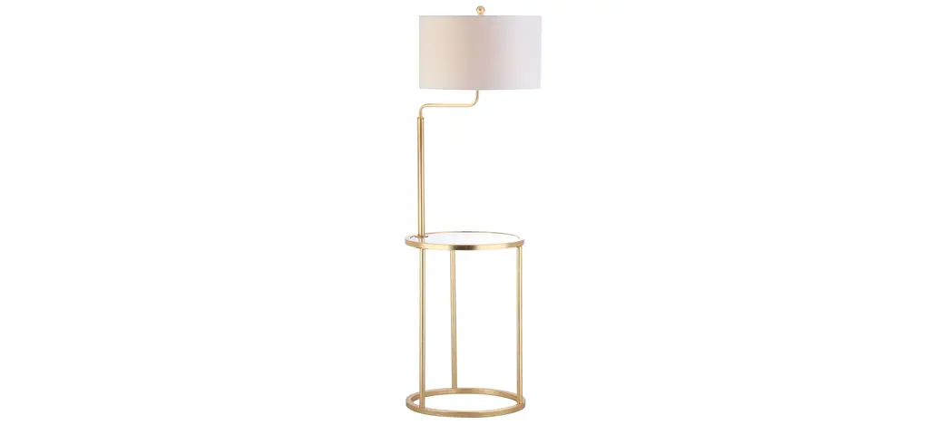 Inspired by the newly renovated lounge in Manhattan's grandest hotel, this Birch Floor Lamp is ideal for the modern living room. Imbued with style and substance, its gold finish envelopes the sleek lines of the lamp and built in glass side table.