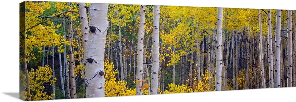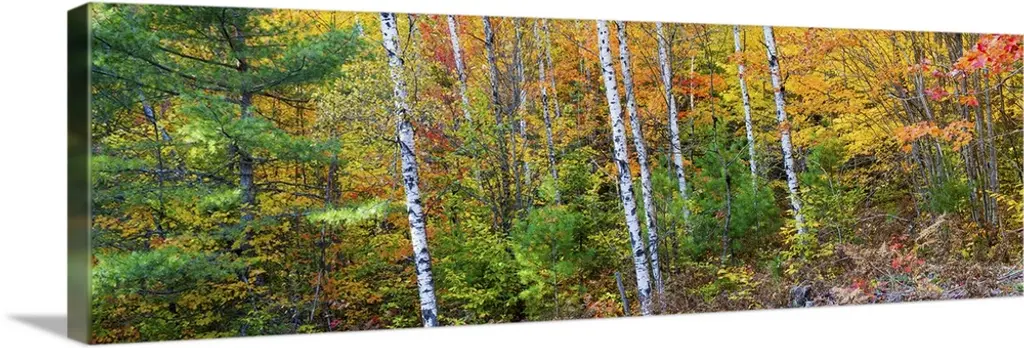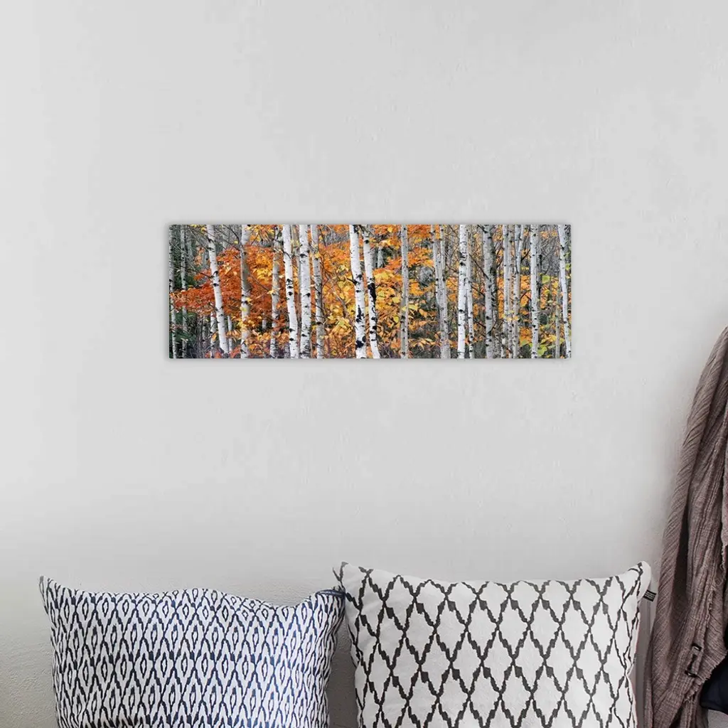 Panoramic photograph of tall bare lightly colored tree barks surrounded by autumn foliage in Ontonagon County, Michigan.