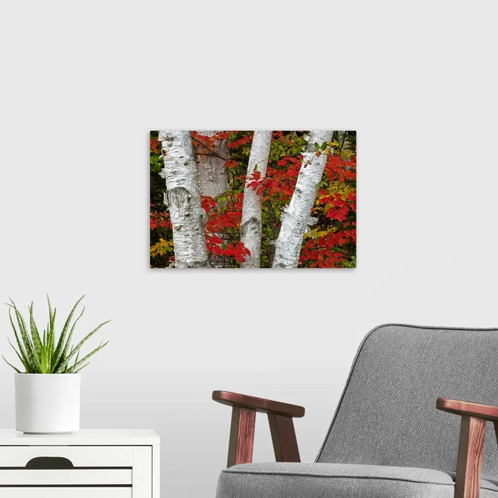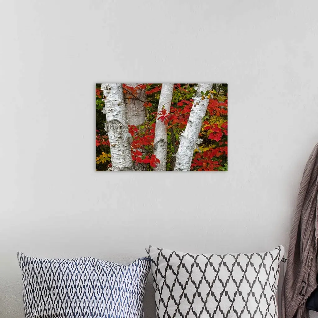 Birch Trees Surrounded By Red Maple Leaves In Algonquin Park, Ontario, Canada wall art for home and office decor. Discover canvas art prints, photos, mural, big canvas art and framed wall art in GreatBigCanvas.com's varied collections.