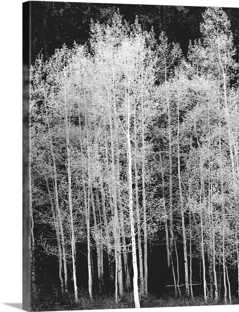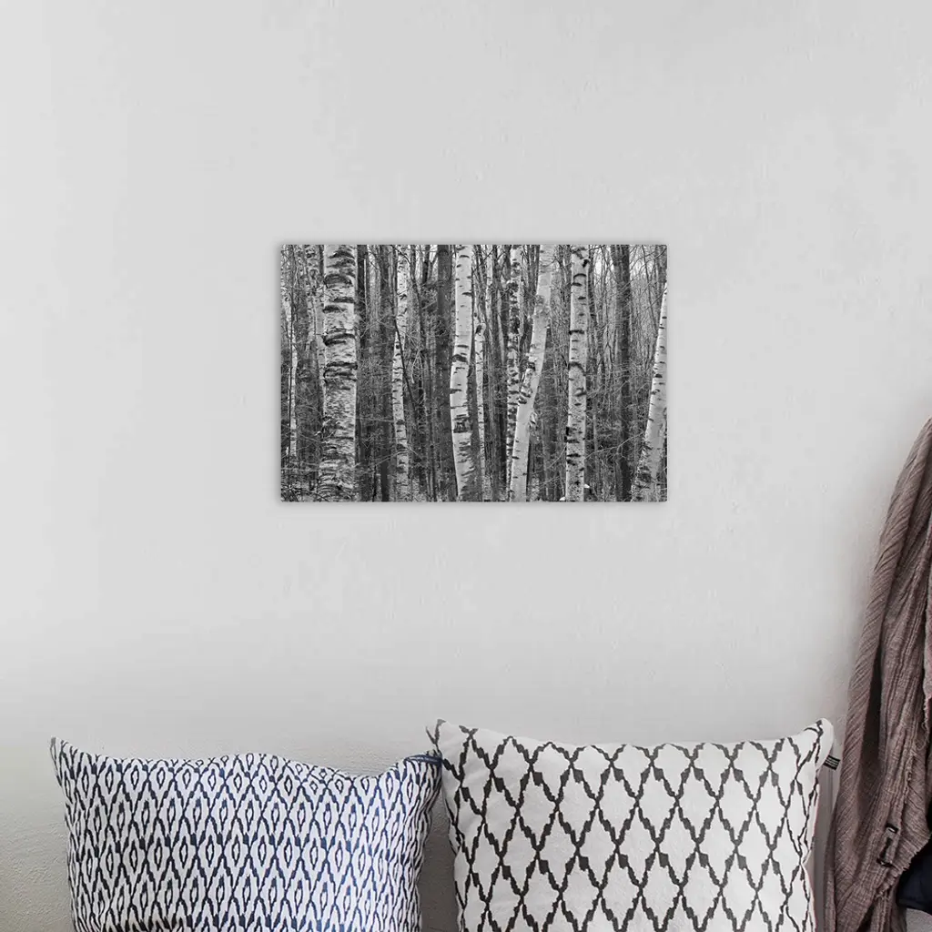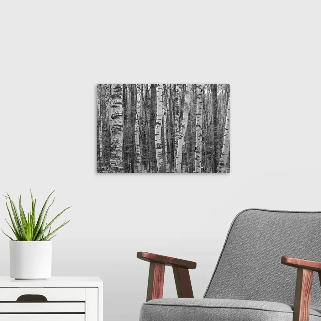Monochromatic rows of birch trees close together on Savoy Mountain in Massachusetts.