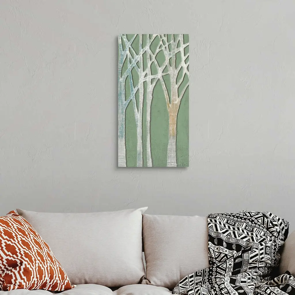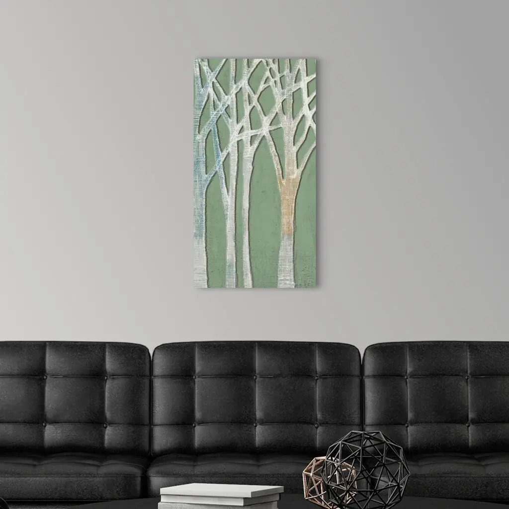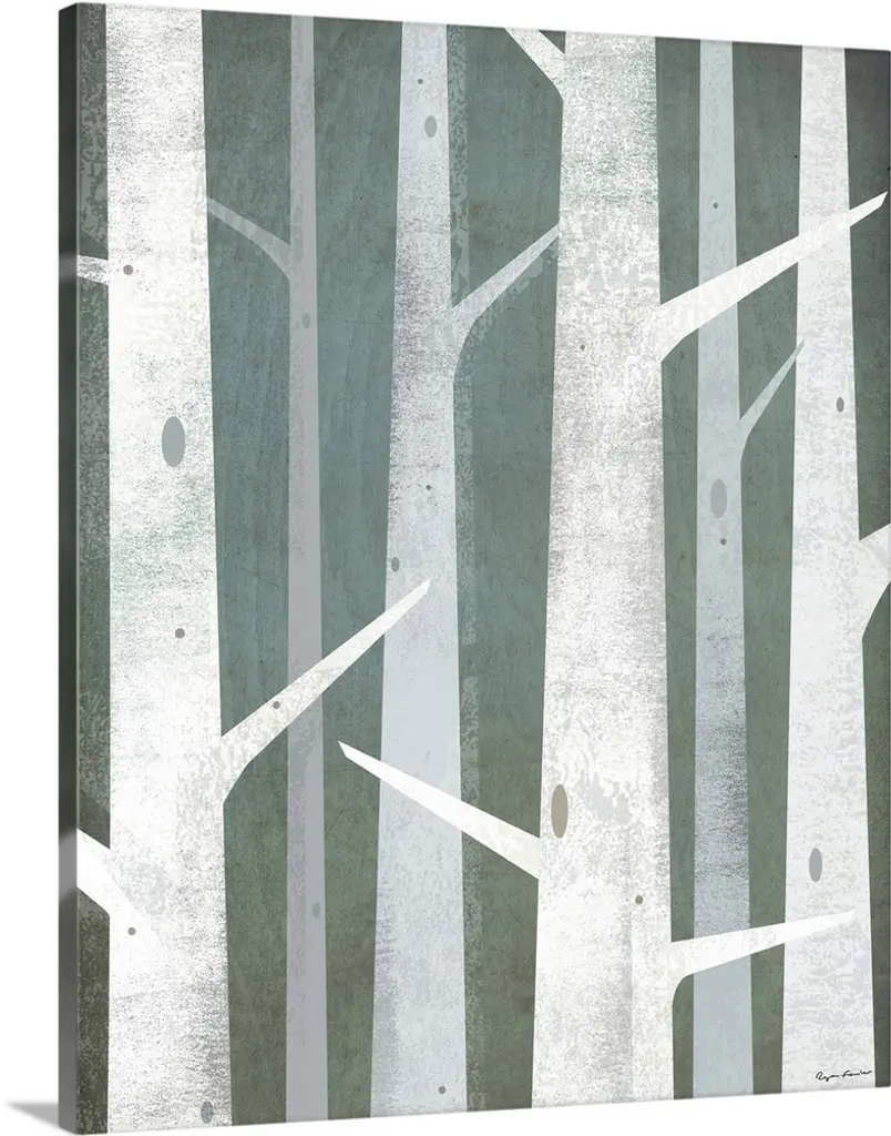 Contemporary home decor art of a birch trees against a pale green background.