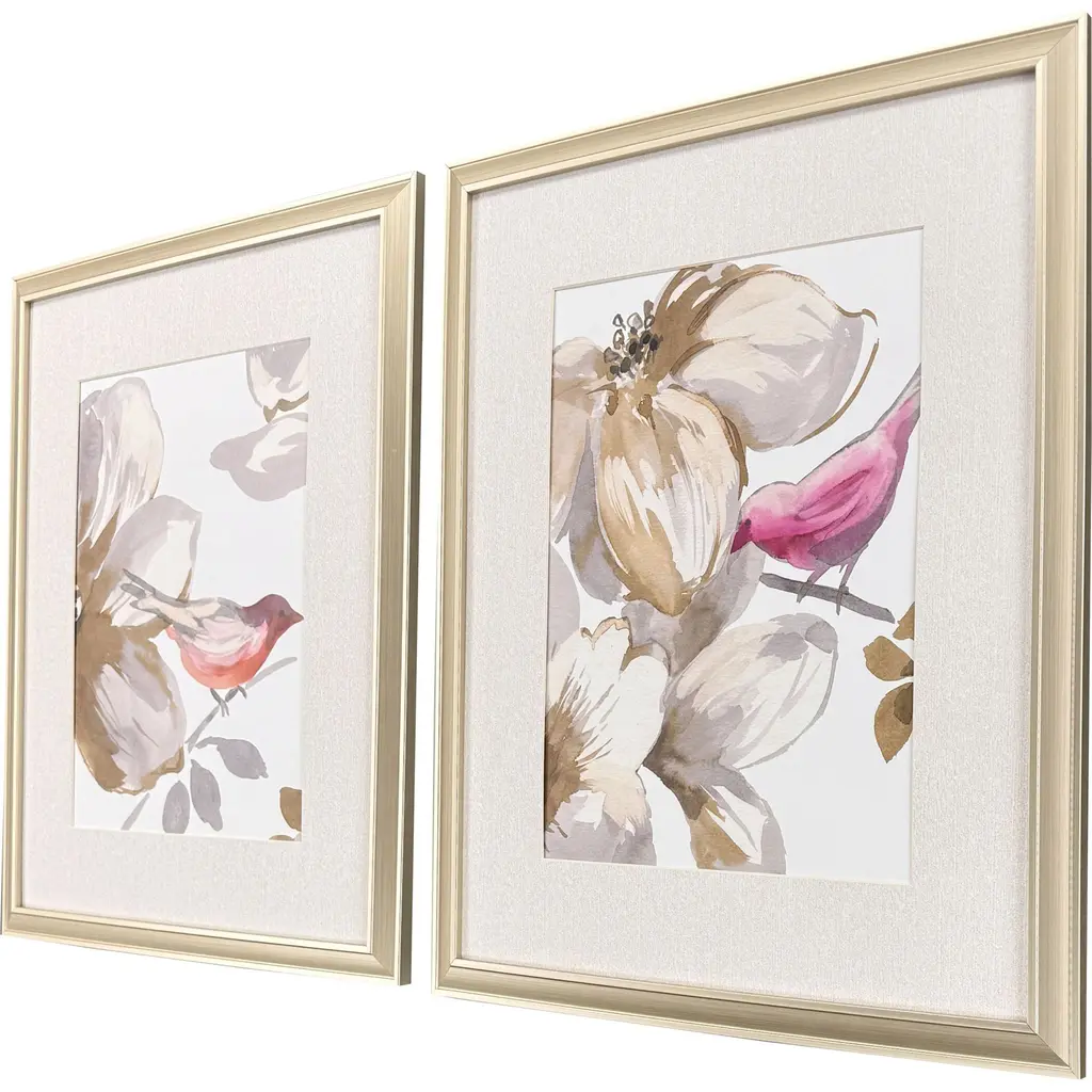 Delightful pink birds flit among blooming florals. The prints feature premium matting and are framed in a champagne gold finish molding.