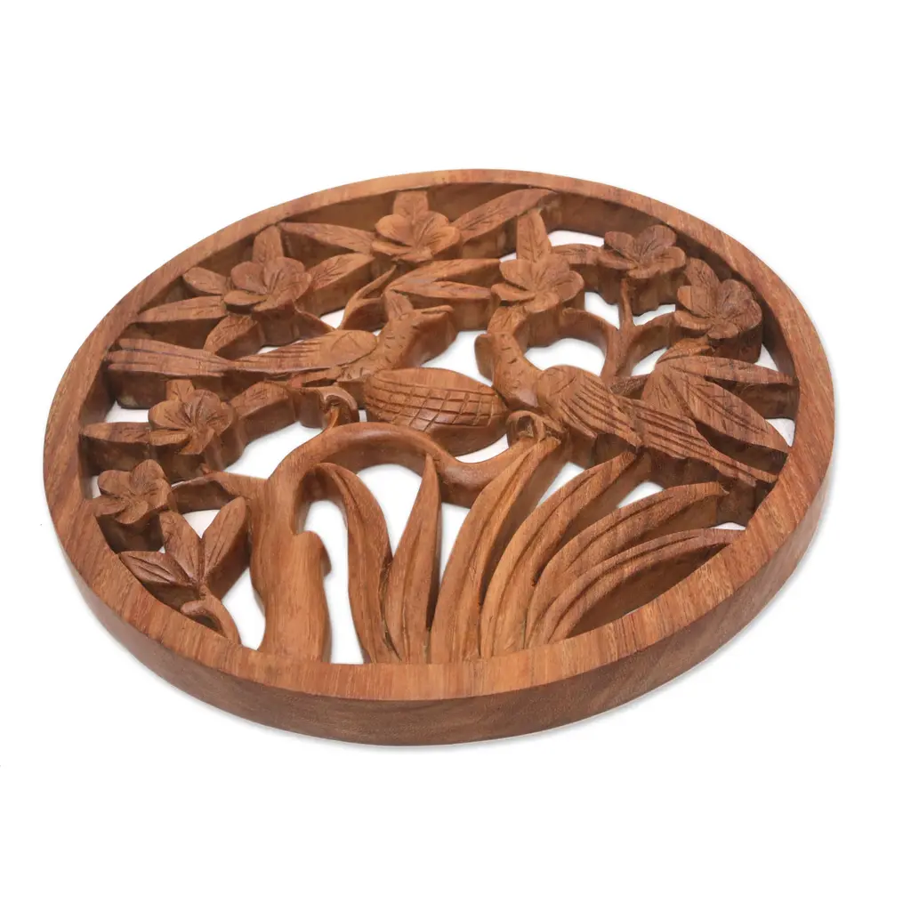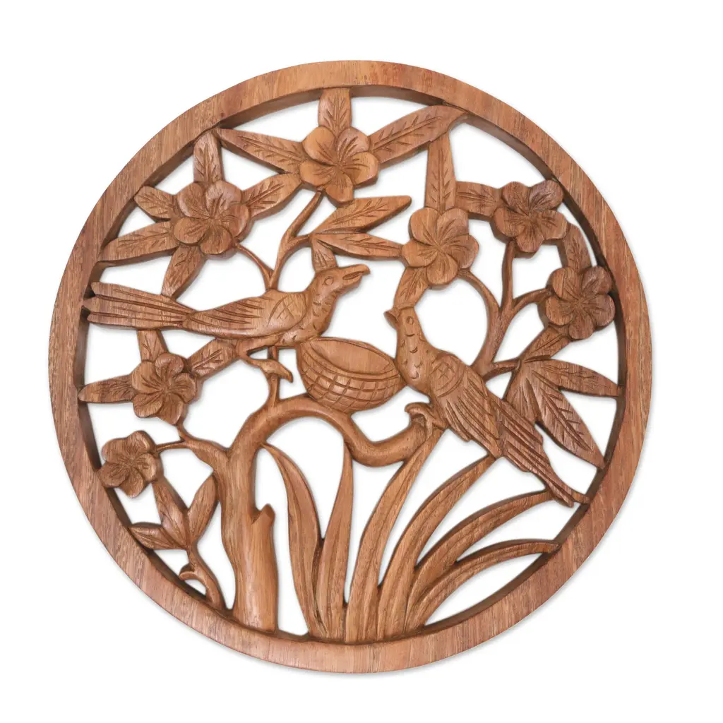 In the branches of a frangipani tree filled with blossoms and leaves, two birds find refuge and peacefully perch amidst the exuberant surroundings. Balinese artisan Made Mulyani designs this extraordinary relief panel carved by hand from local suar wood and featuring a polished finish.
