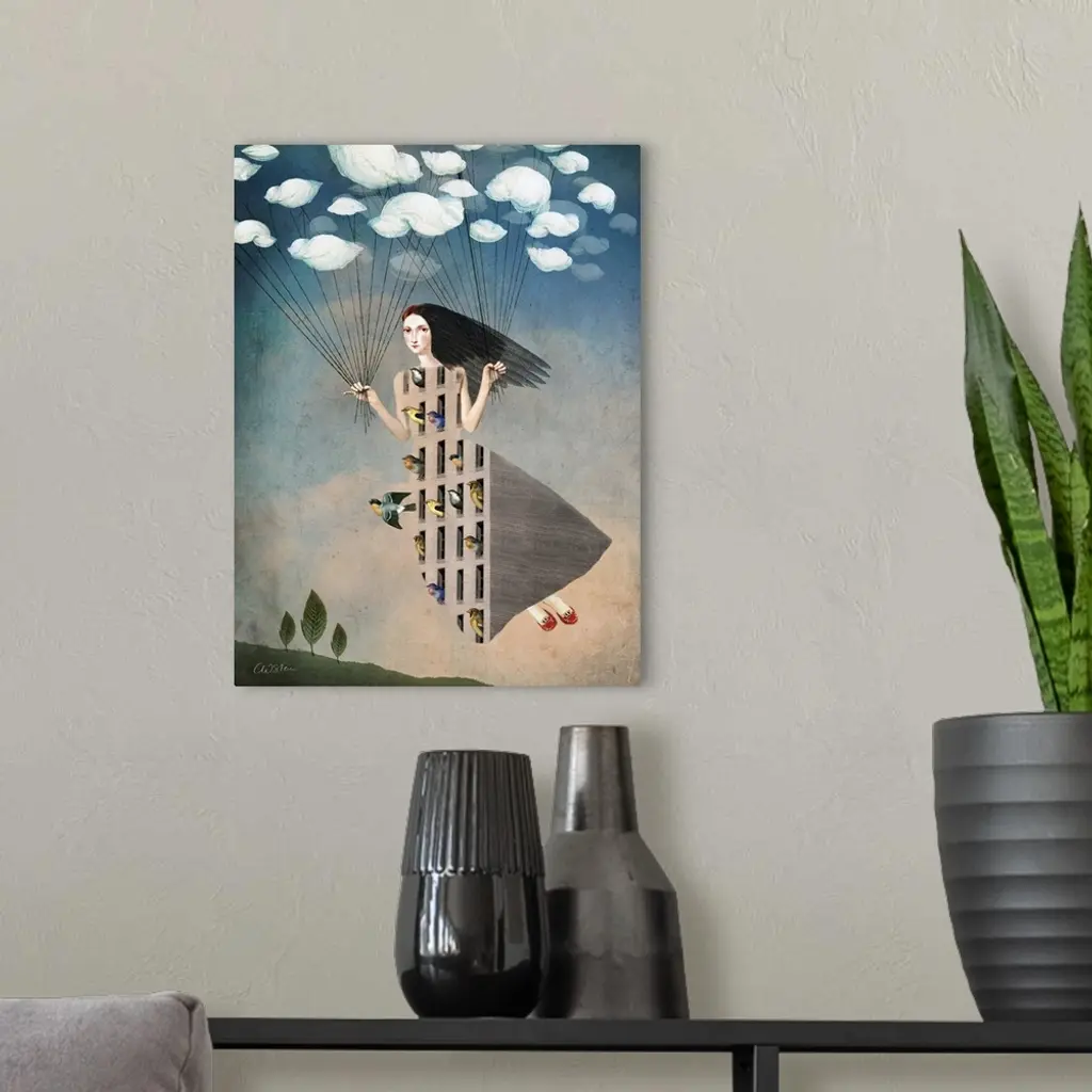 A woman portraying a vessel for a flock of birds is floating in the sky with clouds as balloons.