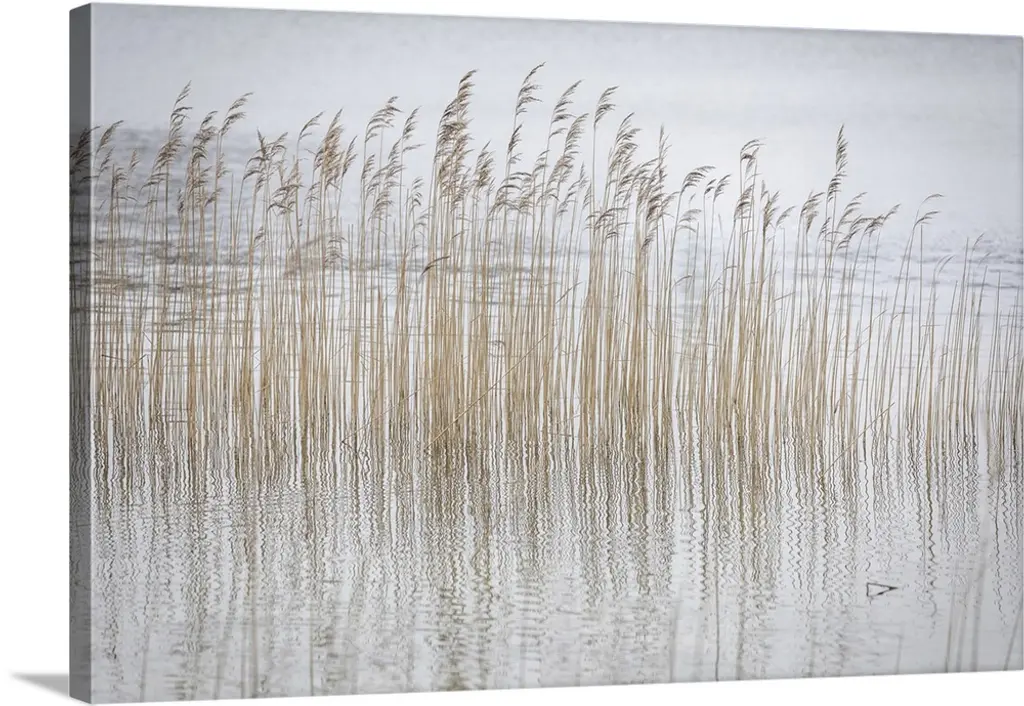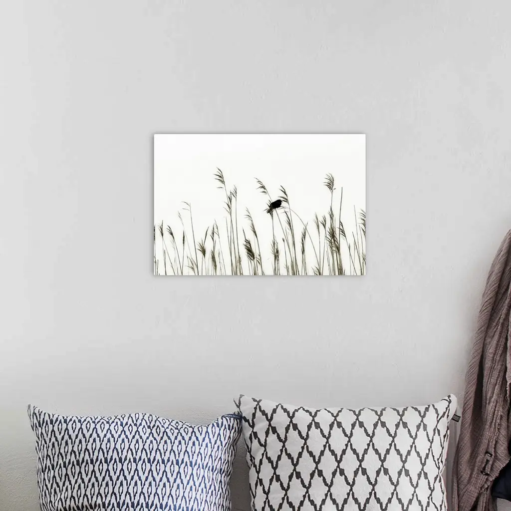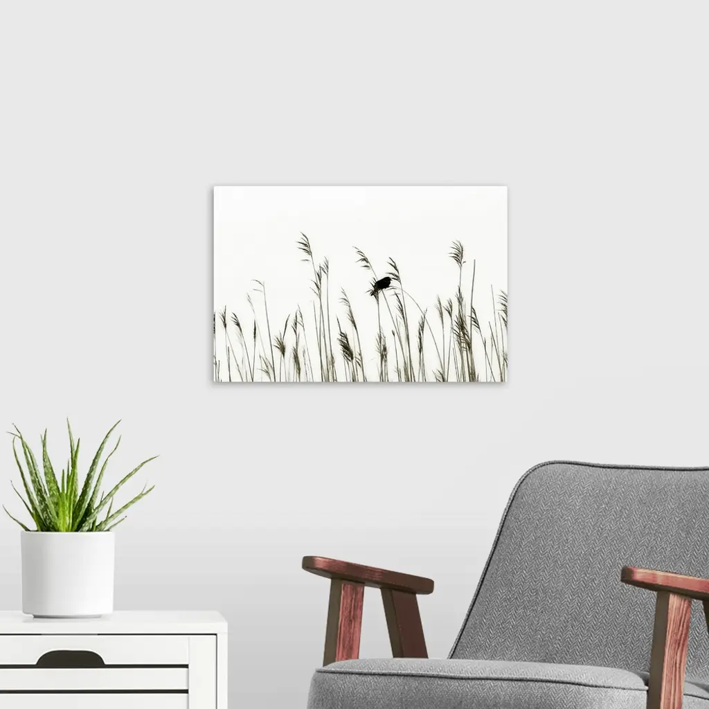 This landscape photograph capture and tiny bird resting on thin bristles of sea grass contrasting with the blank sky behind them.