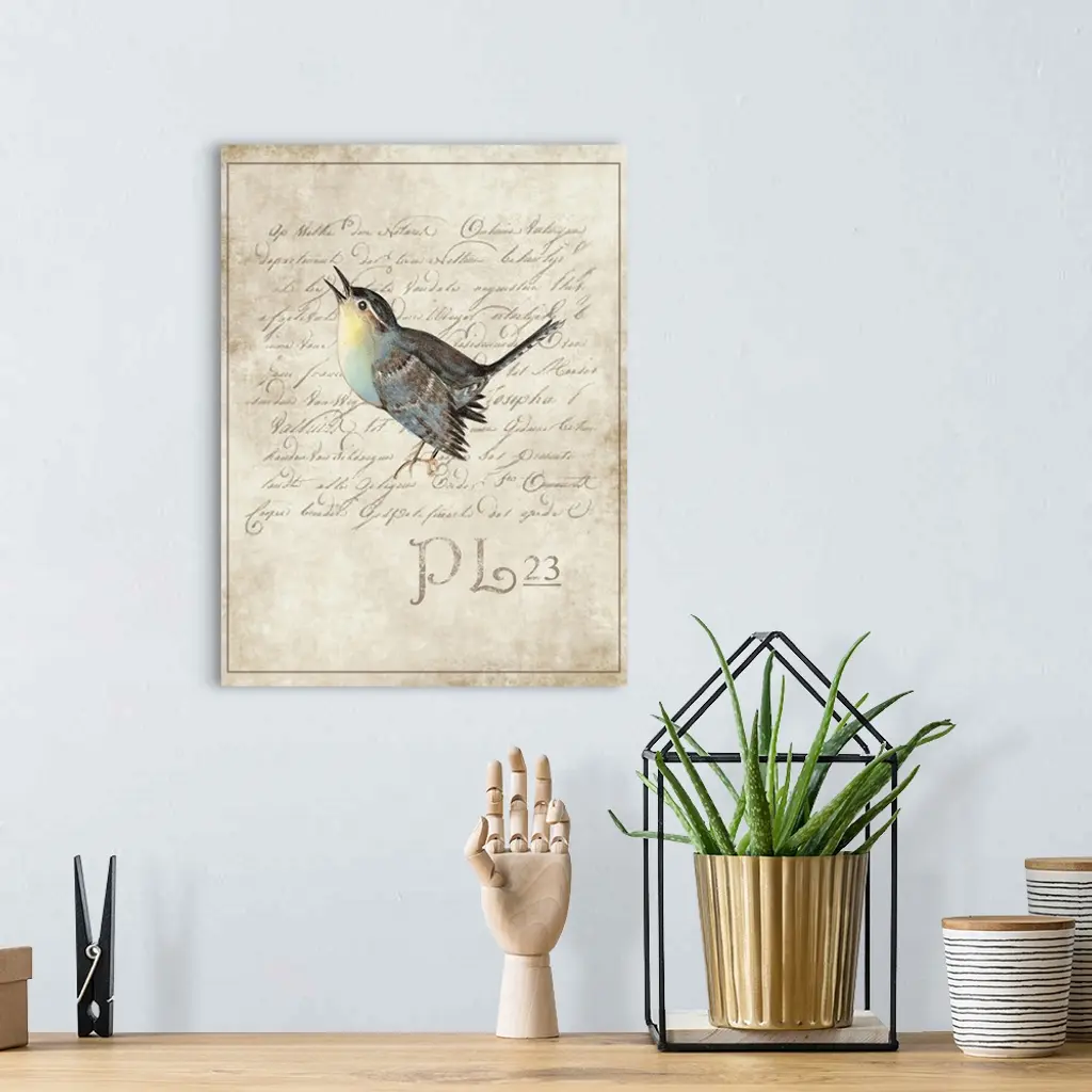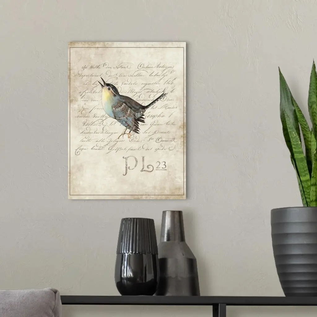 Botanical parchment study of bird adds elegant, nature-inspired touch to any room.