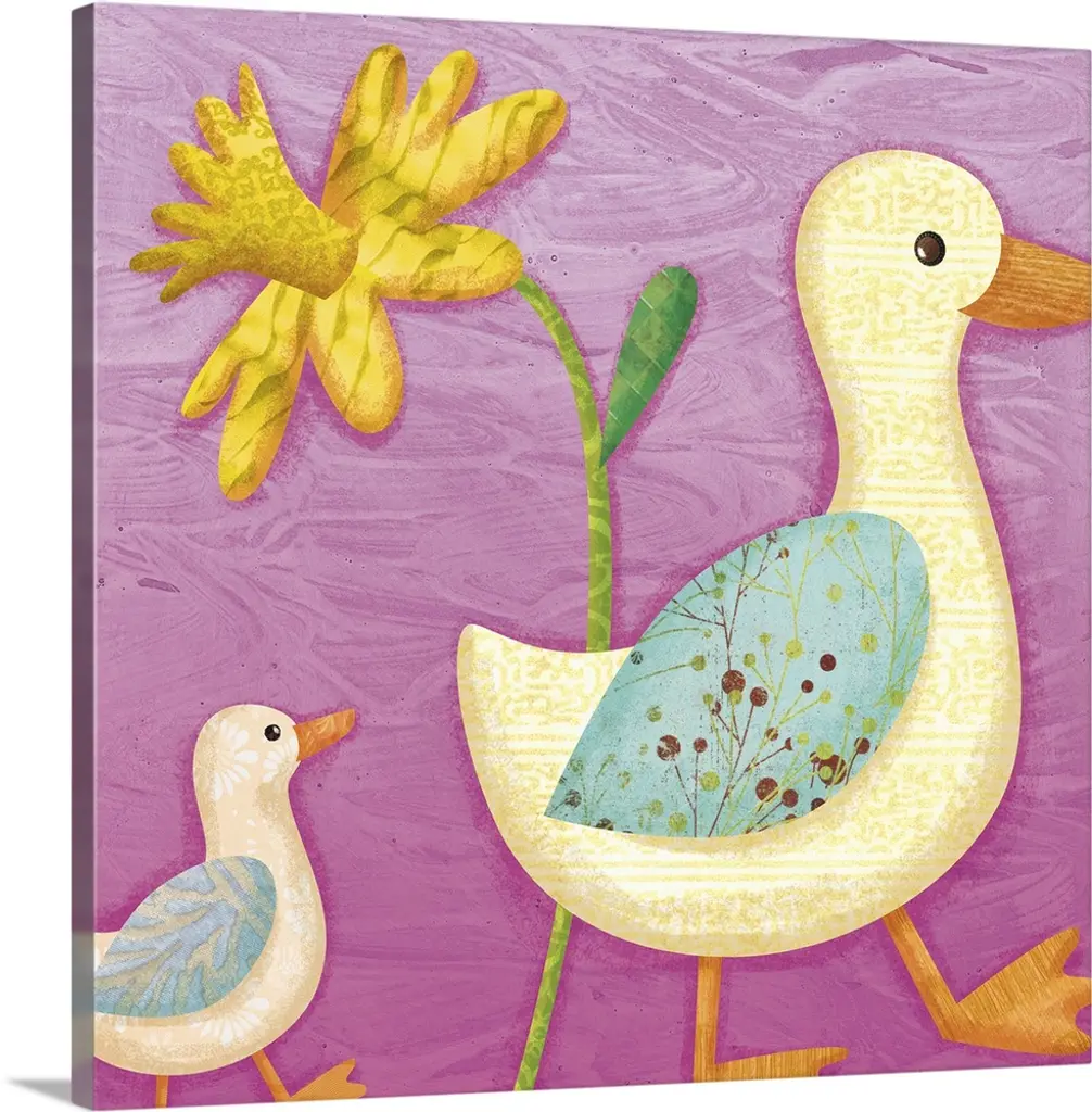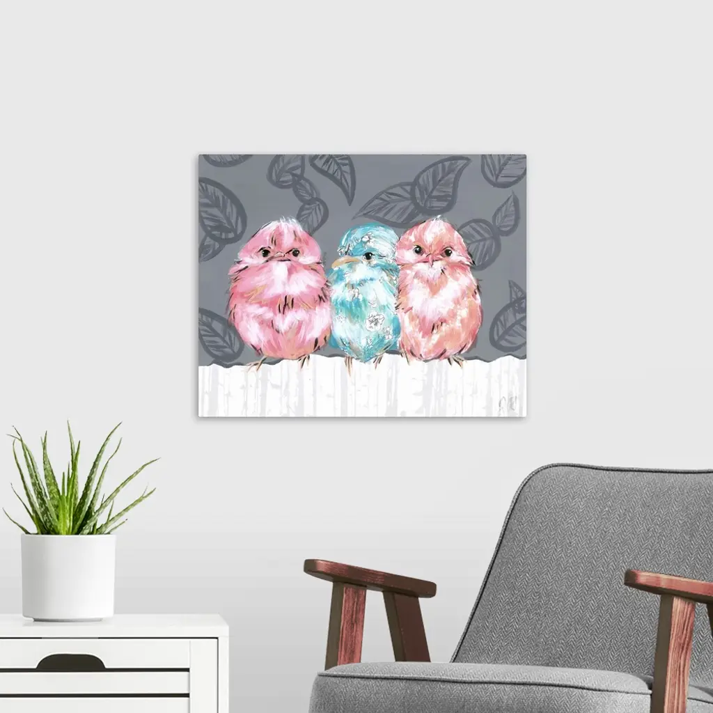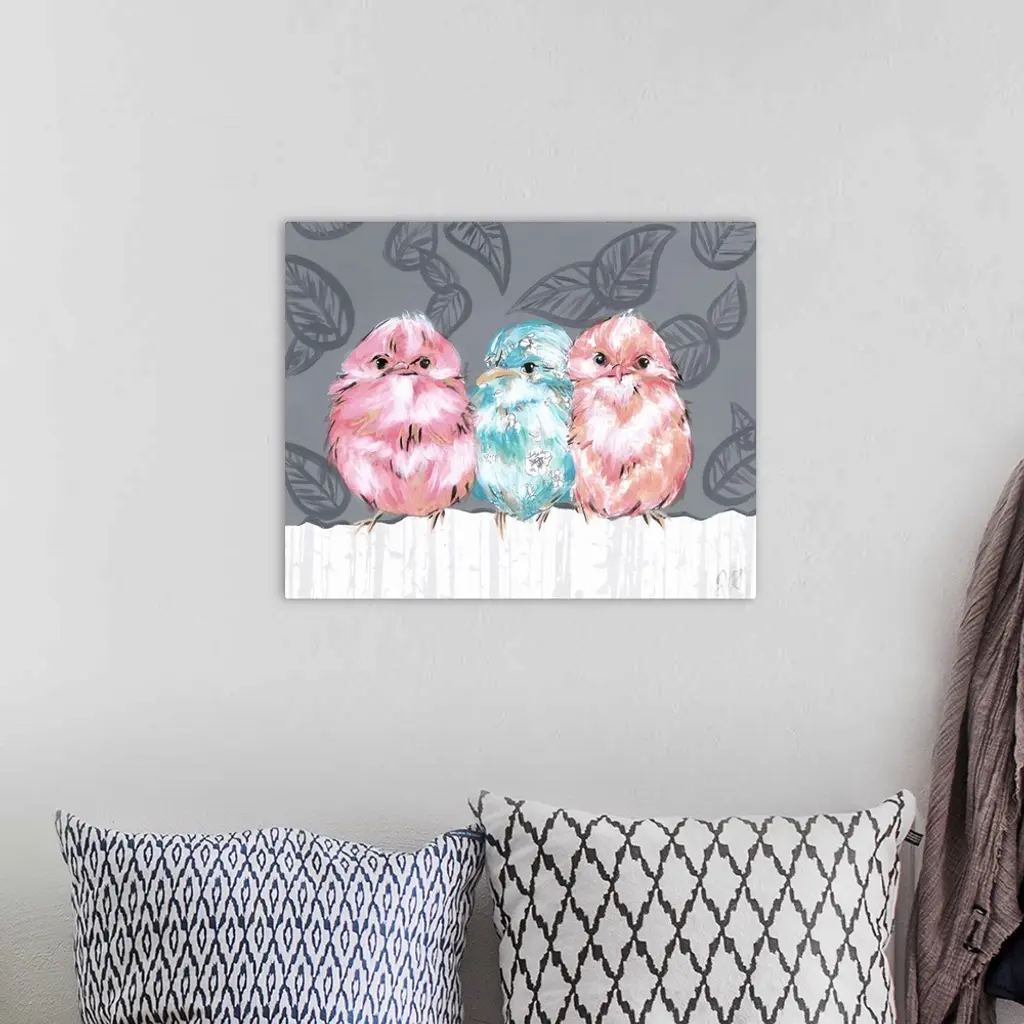 Three bright colored birds in pink, peach and blue, perched on a white fence against a grey leaf patterned background.