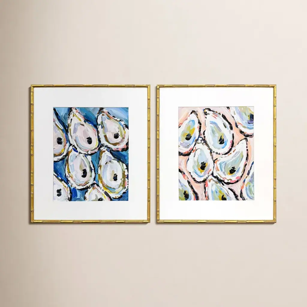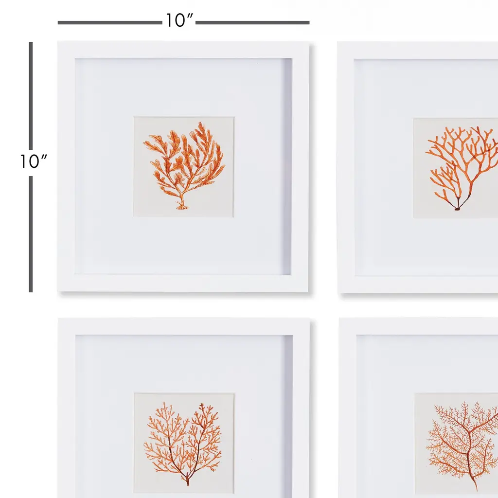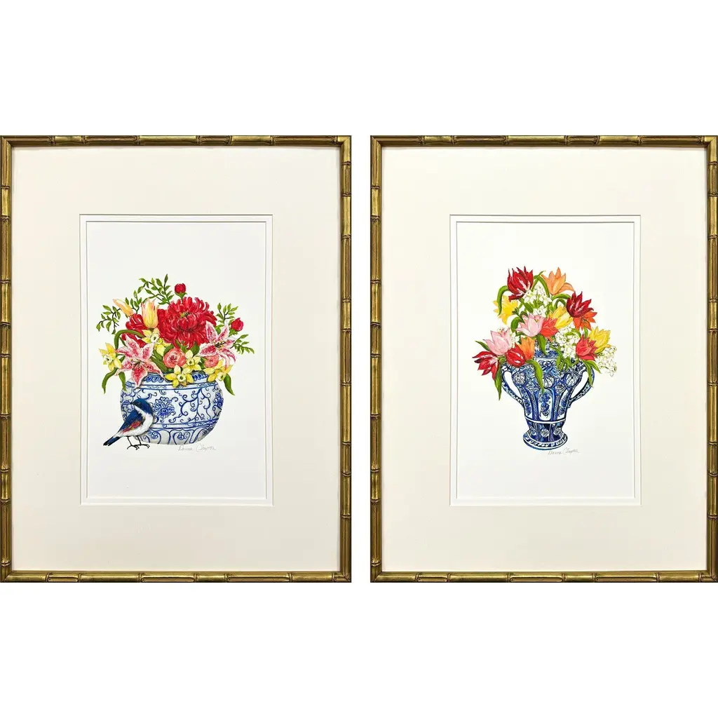 Sea life specimens provide an engaging perch for tanager avians. Matted in white and framed in an antique gold wood with bamboo pattern embossing.