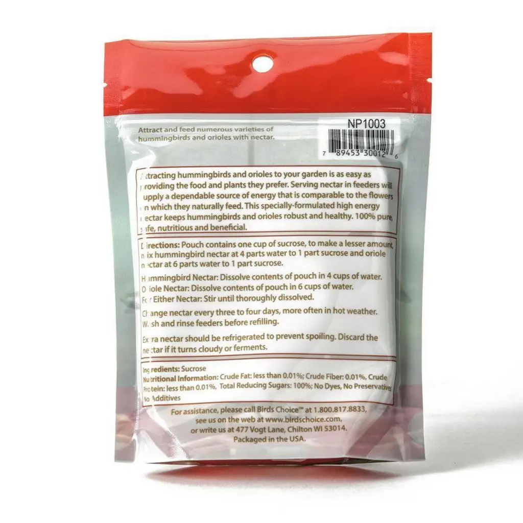 This package makes 4 cups of hummingbird nectar or 6 cups of oriole nectar. Supply a high-energy nectar and keep orioles and hummingbirds healthy and robust. This pure and nutritious nectar simulates the natural nectar found in flowers and will keep your favorite birds in your yard. Never add food coloring to nectar. Resealable pouch.